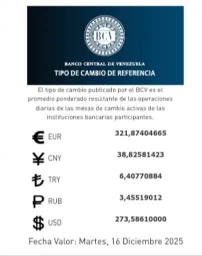 El precio del dólar en el mercado oficial aumentó un 1,03 % al cierre del lunes 15 de diciembre, situándose en 273,59 bolívares por unidad. Este valor será la tasa de cambio oficial obligatoria para las operaciones del martes 16 en el país.