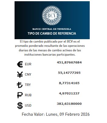 Por otro lado, el euro BCV cerró la jornada en un valor de 451,87 bolívares según el Banco Central de Venezuela (BCV), con un incremento diario del 0,45 %, mientras que el aumento semanal, comparado con la anterior, fue del 2,59 %.