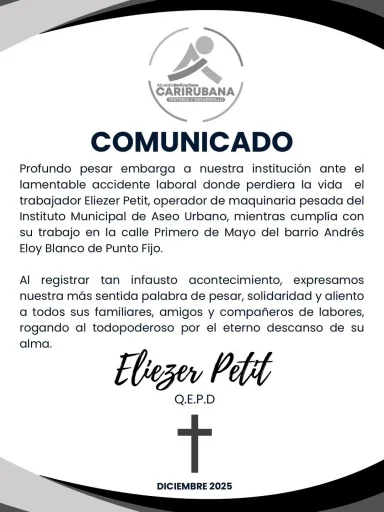 La Alcaldía de Carirubana, a través de un comunicado, lamentó la muerte del trabajador de Imaseo, Eliézer Petit. Además, envió palabras de condolencias para sus familiares, amigos y compañeros de trabajo.
