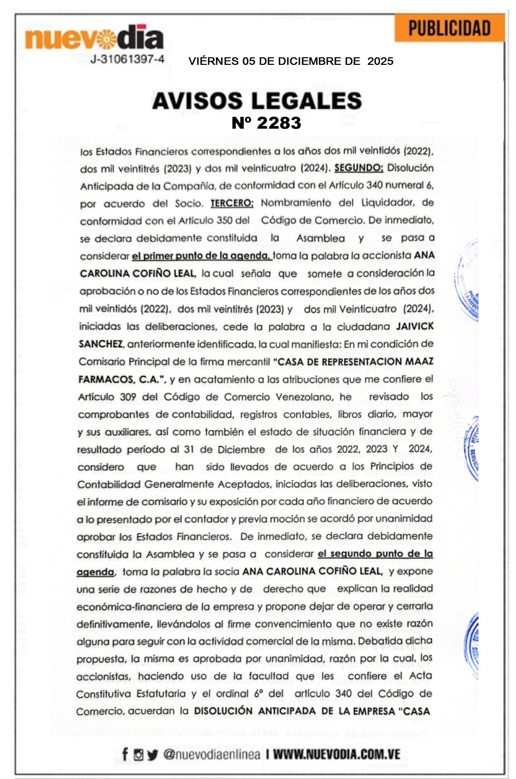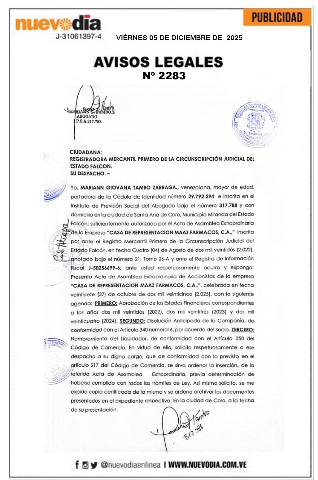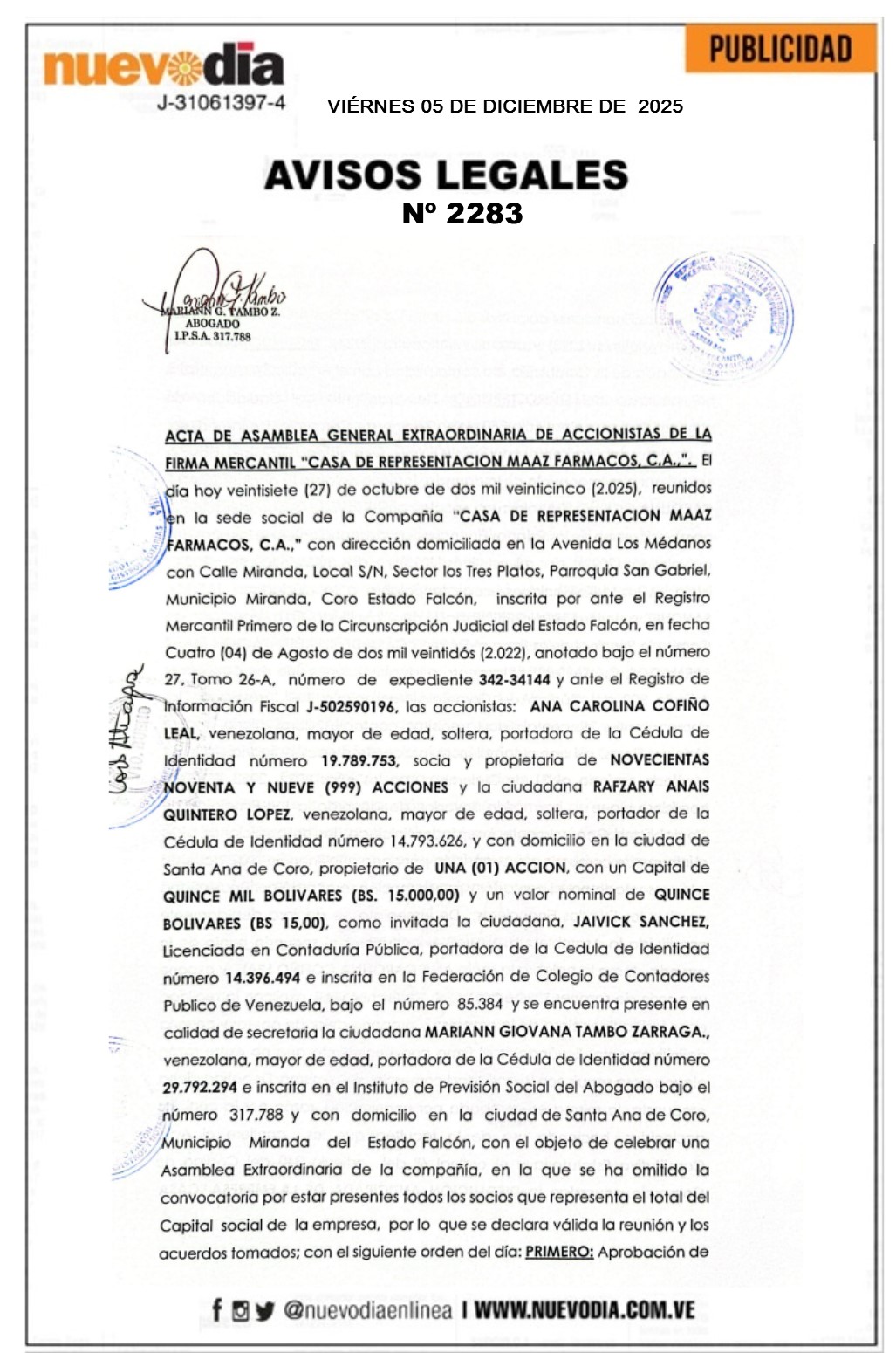 Acta Asamblea Extraordinaria.Casa de Representación Maaz Farmacos.C.a.