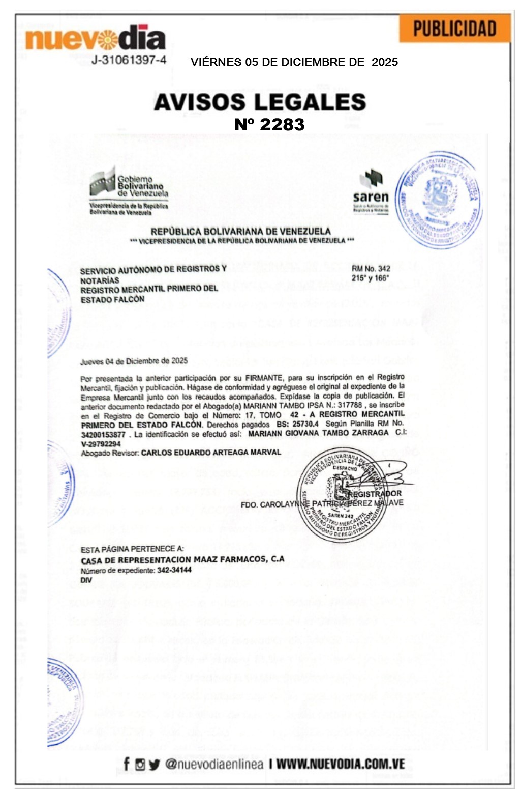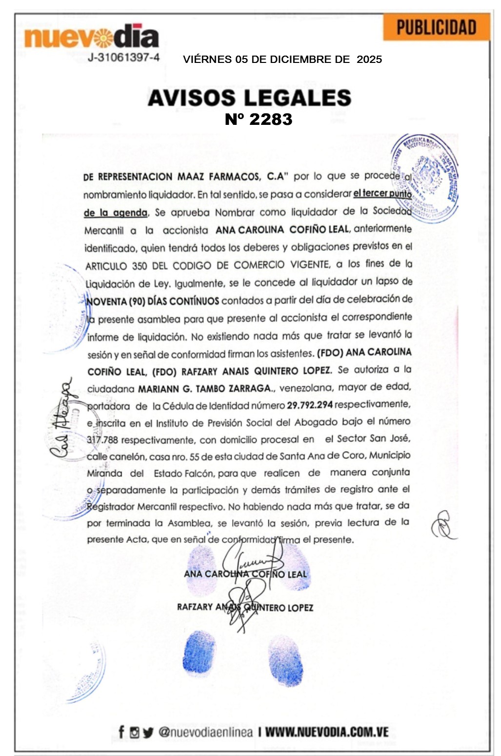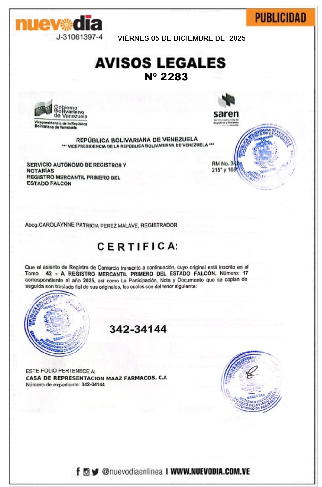 Acta Asamblea Extraordinaria.Casa de Representación Maaz Farmacos.C.a.
