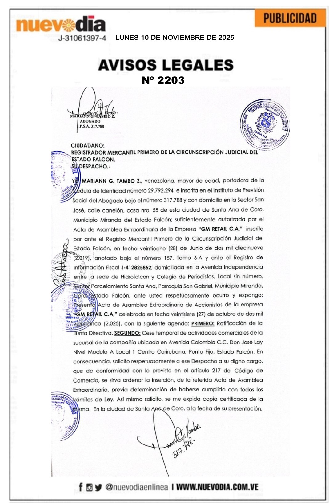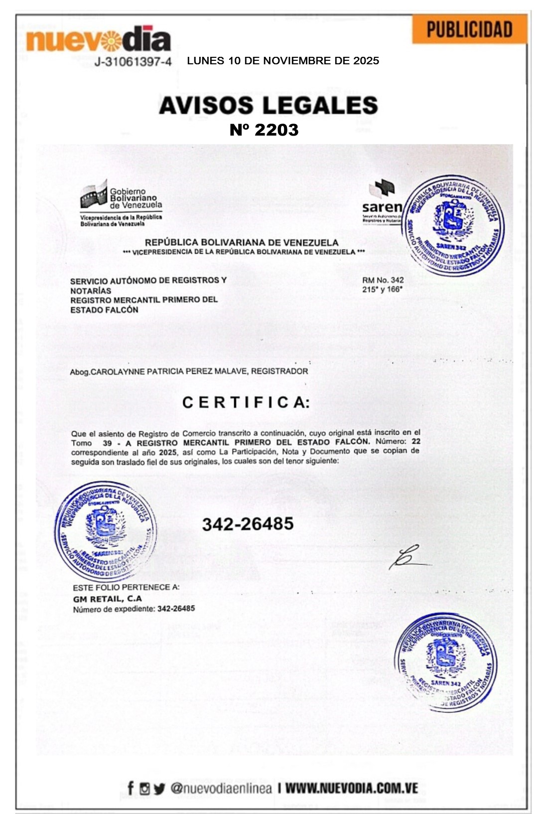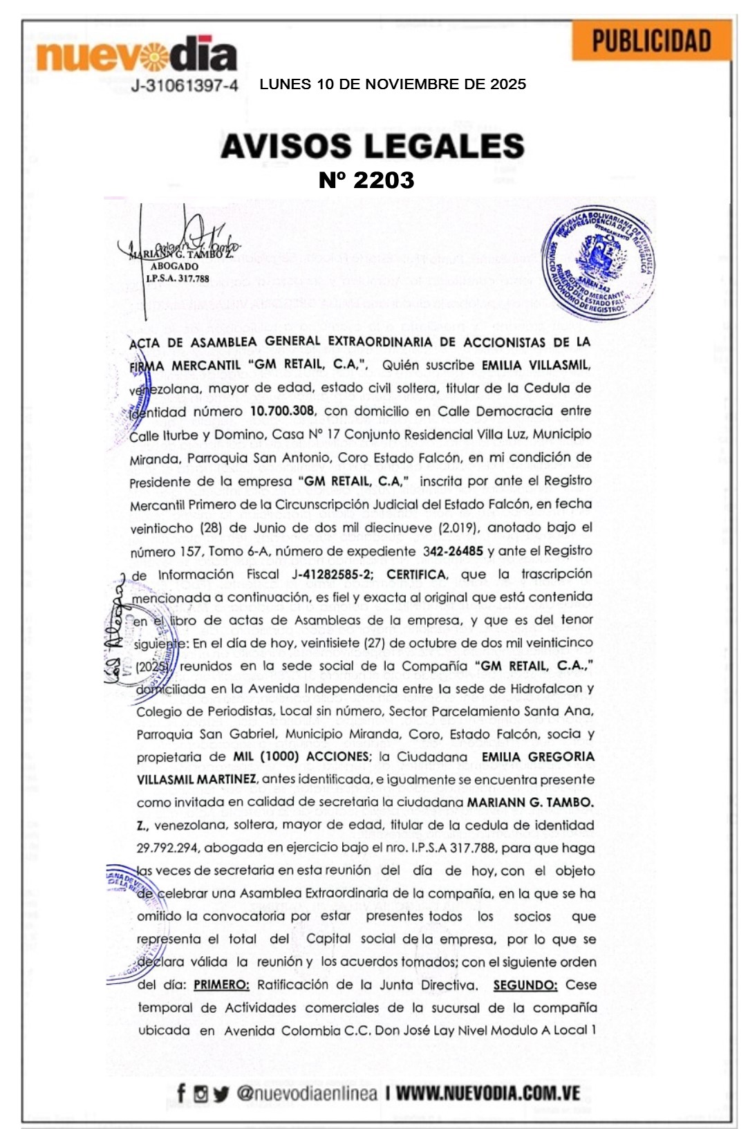 InicioPublicidadLegales PublicidadLegales Acta Asamblea Extraordinaria.GM Retail.C.A. 10/11/2025 FacebookTwitterPinterestWhatsApp 2203- 10-11-2025 Cuota FacebookTwitterPinterestWhatsApp Artículo anteriorPueblo de Miranda postulará miembros a los comités bolivarianos integrales de calleArtículo siguienteCartel de Emplazamiento.Marianny Carolina Romero Crespo. Mercadeo NuevoDia Noticias Relacionadas Legales Cartel de Emplazamiento.Marianny Carolina Romero Crespo. Legales Notificación.Francisco Esteban Yánez Rodríguez. Legales Edicto.Nidia Chiquinquira Delgado. Redes Sociales20,299FansMe gusta112,425SeguidoresSeguir4,600SuscriptoresSuscribirte Últimas noticias Destacadas Incautan 1.253 kilos de súper marihuana en Lara +DETALLES Destacadas Gasto promedio por visita en centros comerciales ronda los $60 Cargar más
