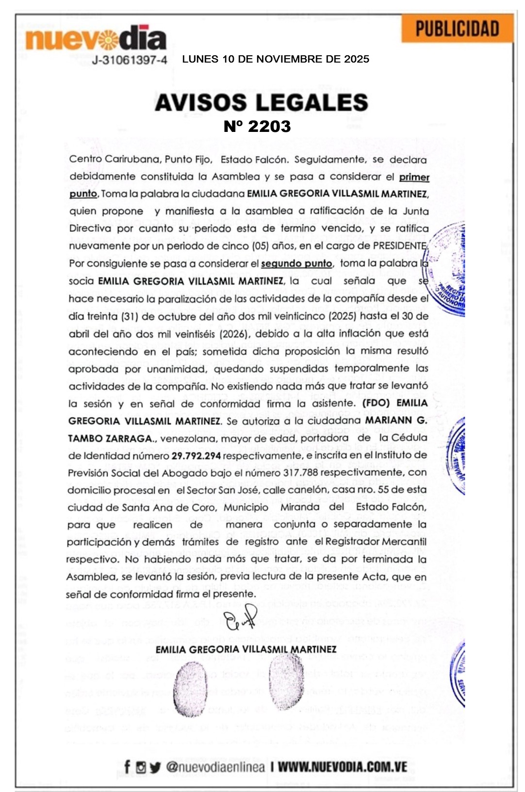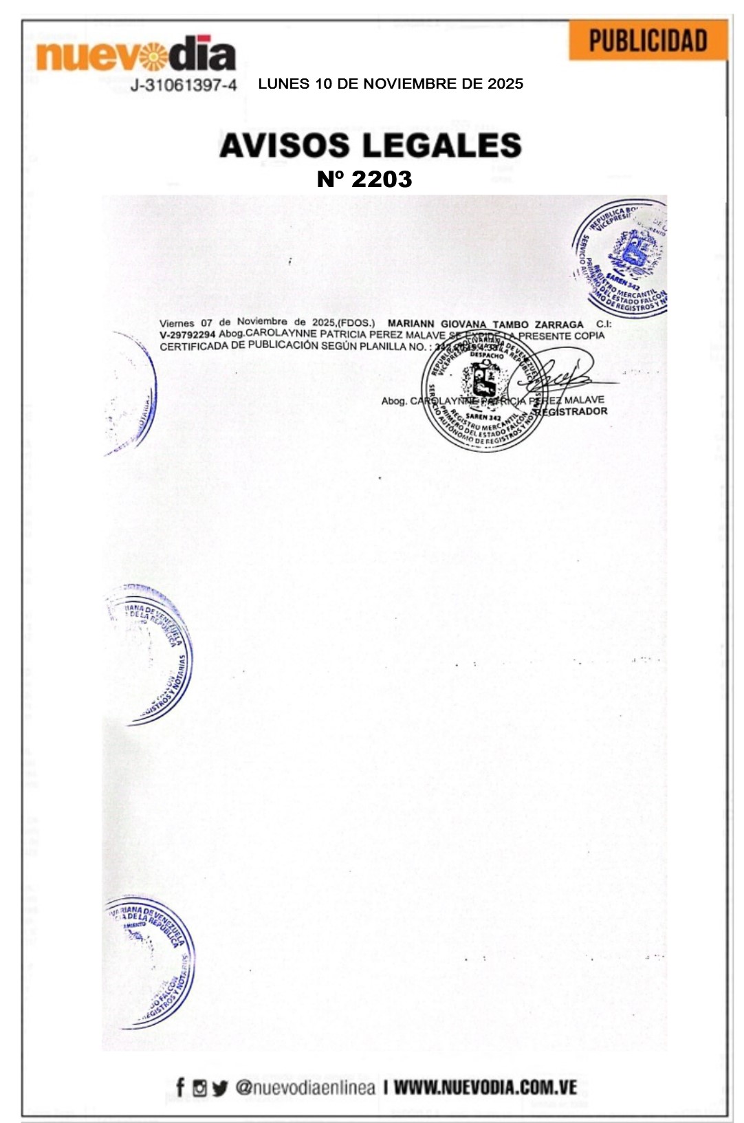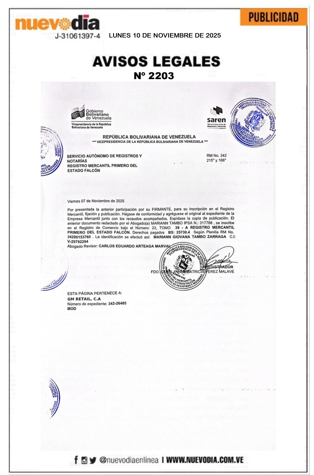 InicioPublicidadLegales PublicidadLegales Acta Asamblea Extraordinaria.GM Retail.C.A. 10/11/2025 FacebookTwitterPinterestWhatsApp 2203- 10-11-2025 Cuota FacebookTwitterPinterestWhatsApp Artículo anteriorPueblo de Miranda postulará miembros a los comités bolivarianos integrales de calleArtículo siguienteCartel de Emplazamiento.Marianny Carolina Romero Crespo. Mercadeo NuevoDia Noticias Relacionadas Legales Cartel de Emplazamiento.Marianny Carolina Romero Crespo. Legales Notificación.Francisco Esteban Yánez Rodríguez. Legales Edicto.Nidia Chiquinquira Delgado. Redes Sociales20,299FansMe gusta112,425SeguidoresSeguir4,600SuscriptoresSuscribirte Últimas noticias Destacadas Incautan 1.253 kilos de súper marihuana en Lara +DETALLES Destacadas Gasto promedio por visita en centros comerciales ronda los $60 Cargar más
