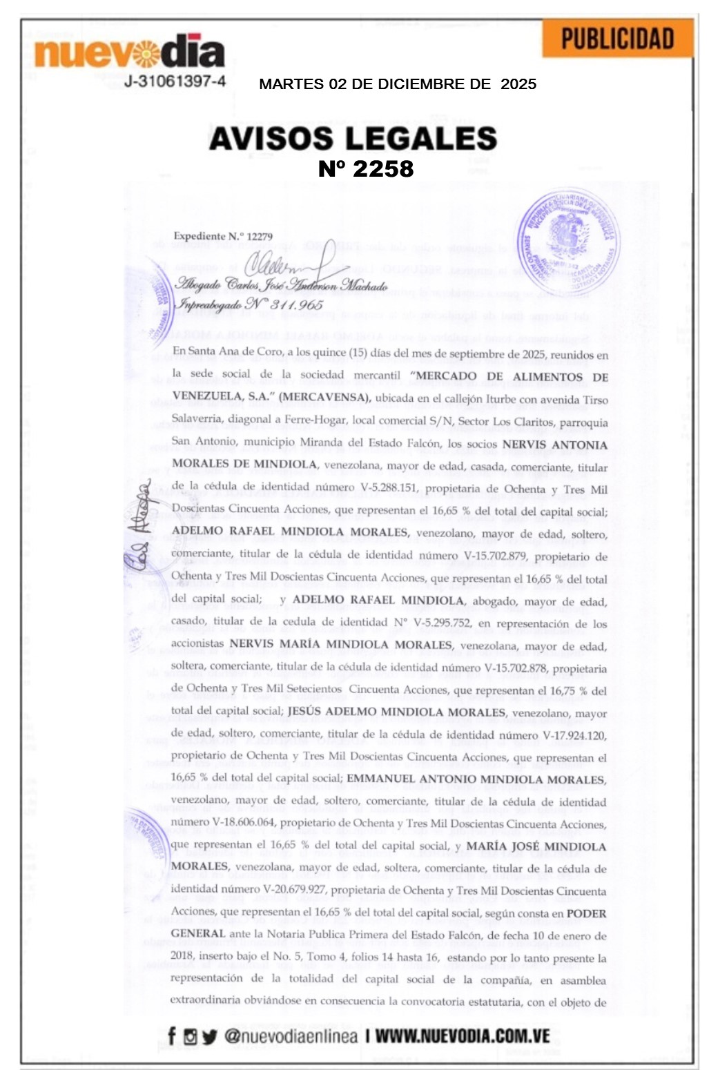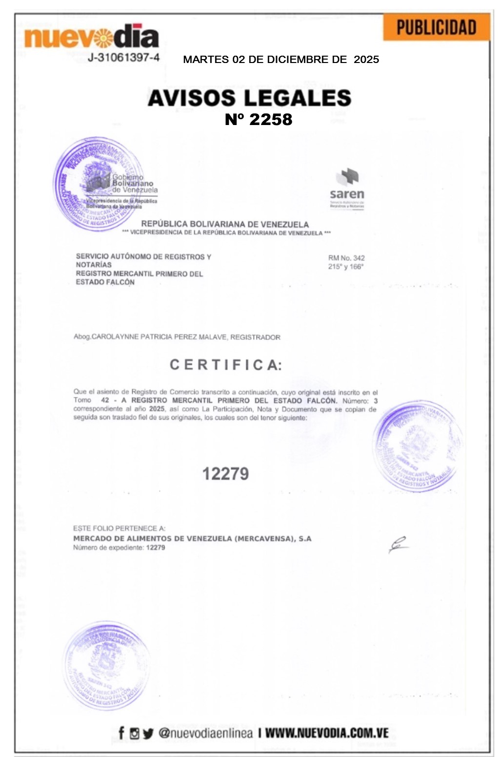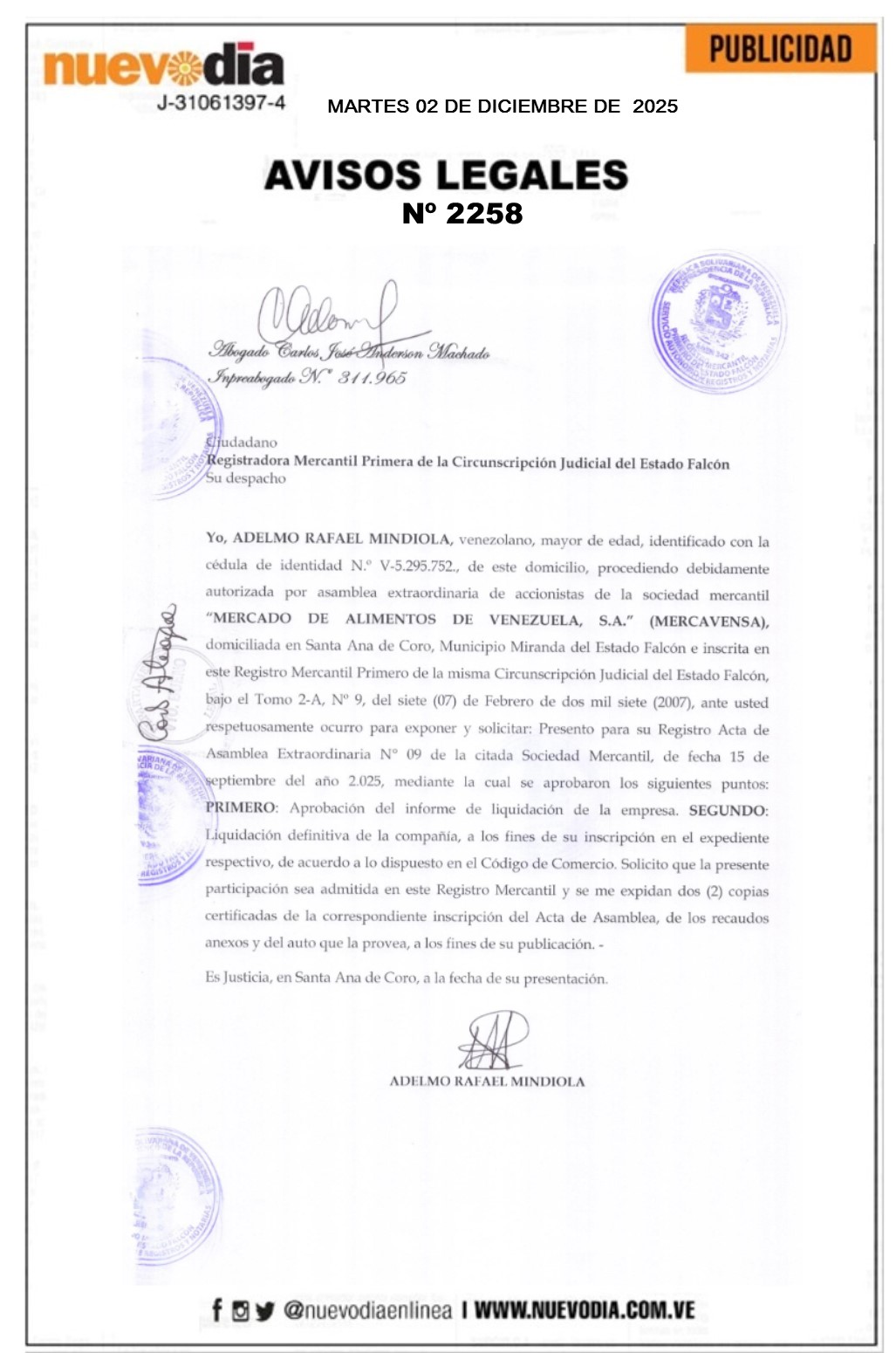 InicioPublicidadLegales PublicidadLegales Acta Asamblea Extraordinaria.Mercado de Alimentos de Venezuela (MERCAVENSA).S.A. 02/12/2025 FacebookTwitterPinterestWhatsApp 2258. 02-12-2025 Cuota FacebookTwitterPinterestWhatsApp Artículo anteriorPiden investigar muerte de joven en vuelco, esto dice su mamáArtículo siguienteLeón XIV insta al cese de hostilidades en Medio Oriente desde Líbano Mercadeo NuevoDia Noticias Relacionadas Legales Cartel de Notificación.Freddy Ramón Suarez Hernández. Legales Resolución de Imposición de Sanción.Inversiones Crisro RCE.C.A. Legales Edicto.Nemesio del Carmen Rivero Marrufo. Redes Sociales20,299FansMe gusta112,425SeguidoresSeguir4,600SuscriptoresSuscribirte Últimas noticias Destacadas Venezuela autoriza reanudar vuelos de repatriación desde EE.UU. Destacadas Designación de nuevos líderes PSUV 2025 reconfigura estructura Cargar más