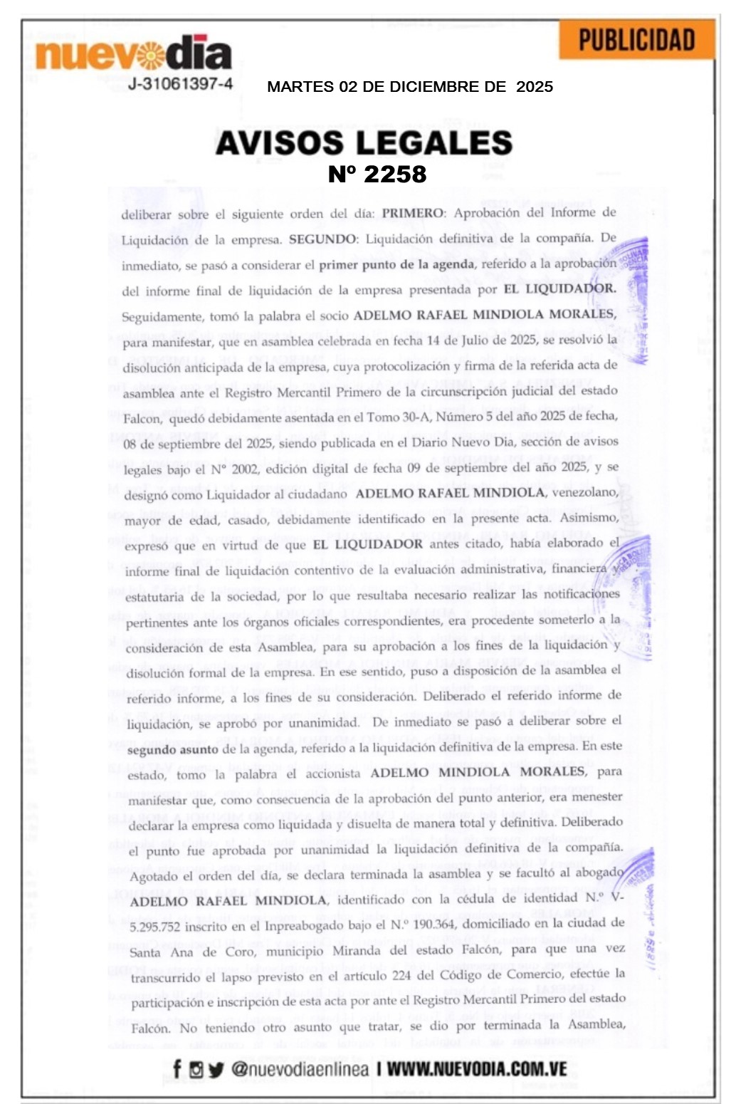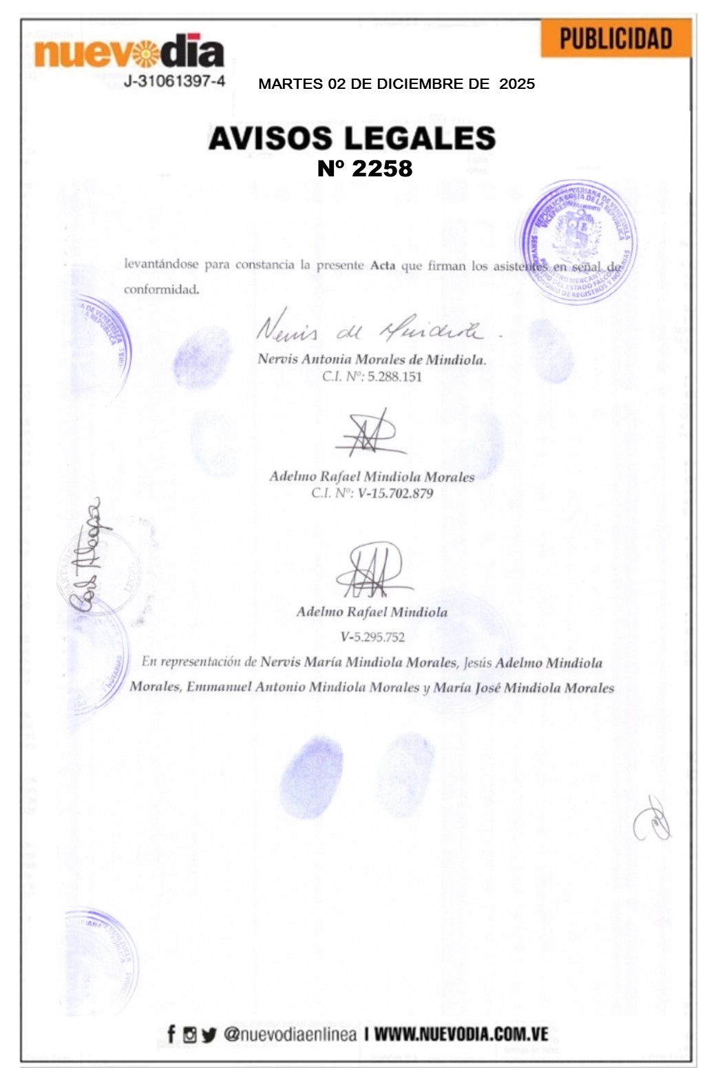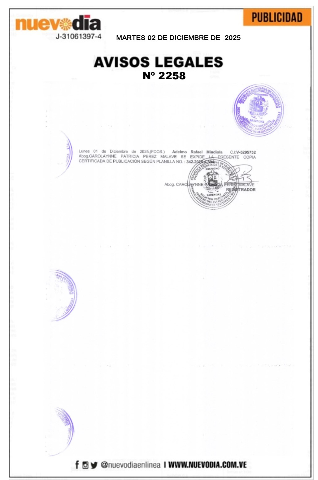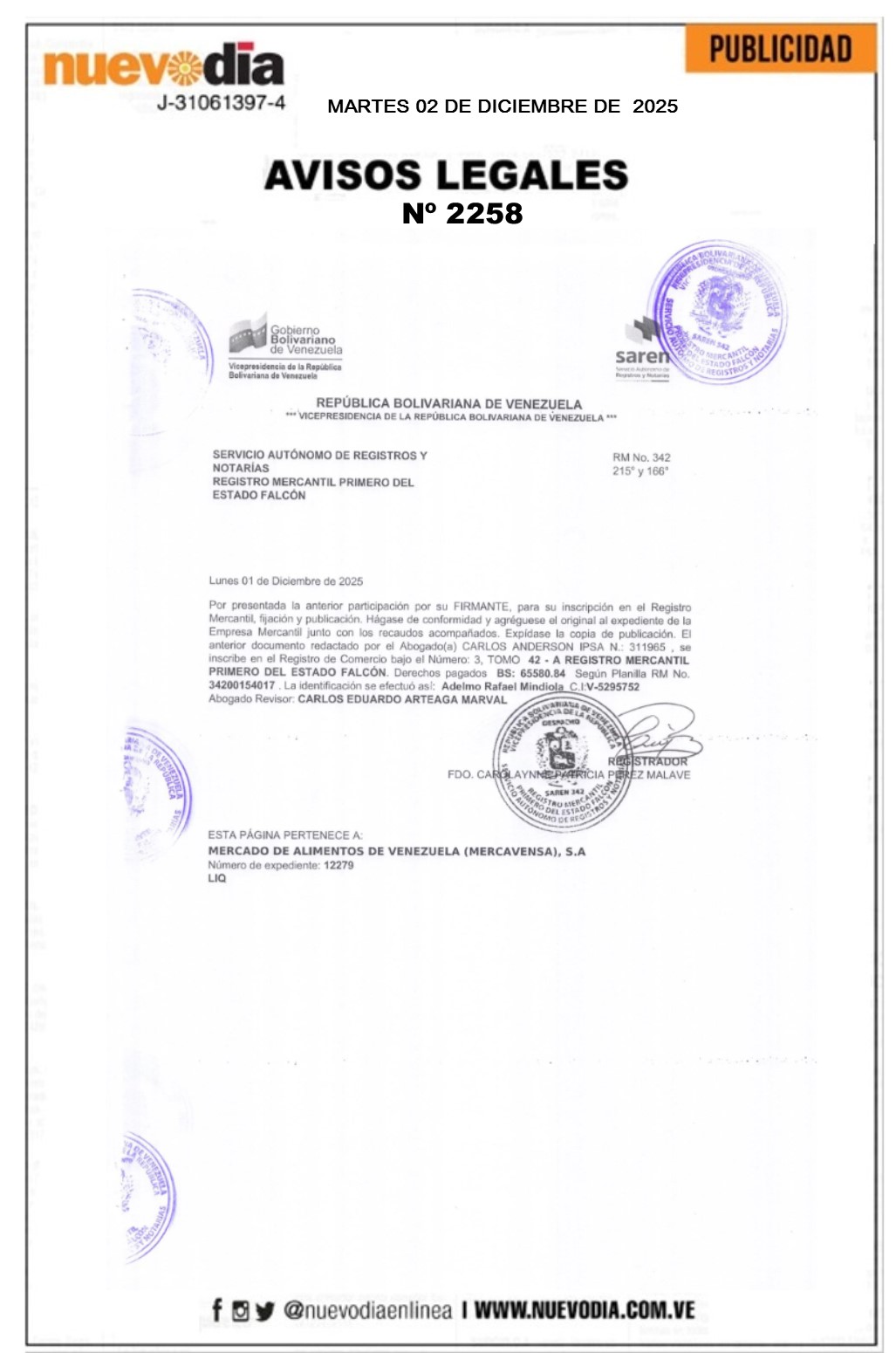 InicioPublicidadLegales PublicidadLegales Acta Asamblea Extraordinaria.Mercado de Alimentos de Venezuela (MERCAVENSA).S.A. 02/12/2025 FacebookTwitterPinterestWhatsApp 2258. 02-12-2025 Cuota FacebookTwitterPinterestWhatsApp Artículo anteriorPiden investigar muerte de joven en vuelco, esto dice su mamáArtículo siguienteLeón XIV insta al cese de hostilidades en Medio Oriente desde Líbano Mercadeo NuevoDia Noticias Relacionadas Legales Cartel de Notificación.Freddy Ramón Suarez Hernández. Legales Resolución de Imposición de Sanción.Inversiones Crisro RCE.C.A. Legales Edicto.Nemesio del Carmen Rivero Marrufo. Redes Sociales20,299FansMe gusta112,425SeguidoresSeguir4,600SuscriptoresSuscribirte Últimas noticias Destacadas Venezuela autoriza reanudar vuelos de repatriación desde EE.UU. Destacadas Designación de nuevos líderes PSUV 2025 reconfigura estructura Cargar más