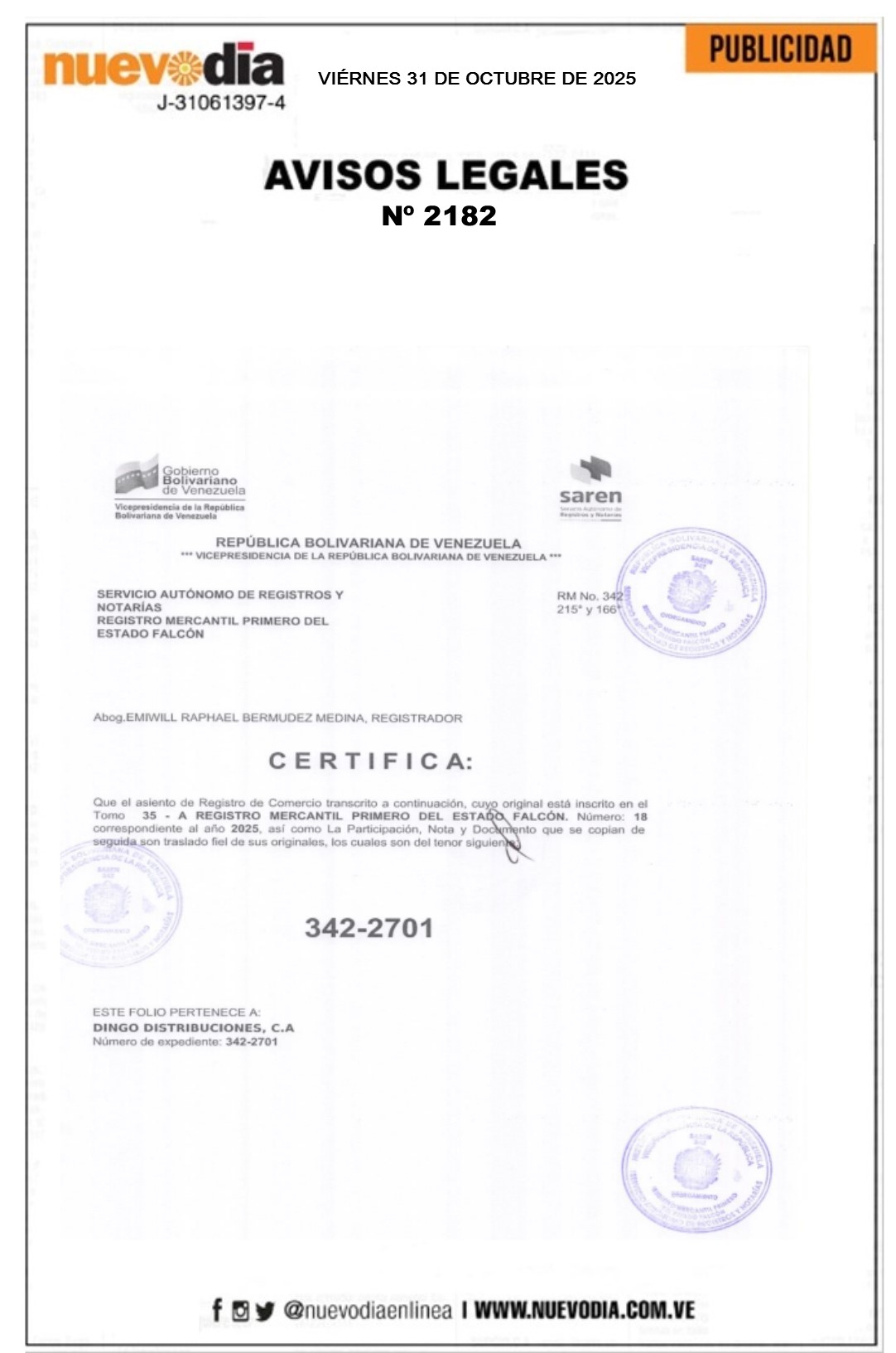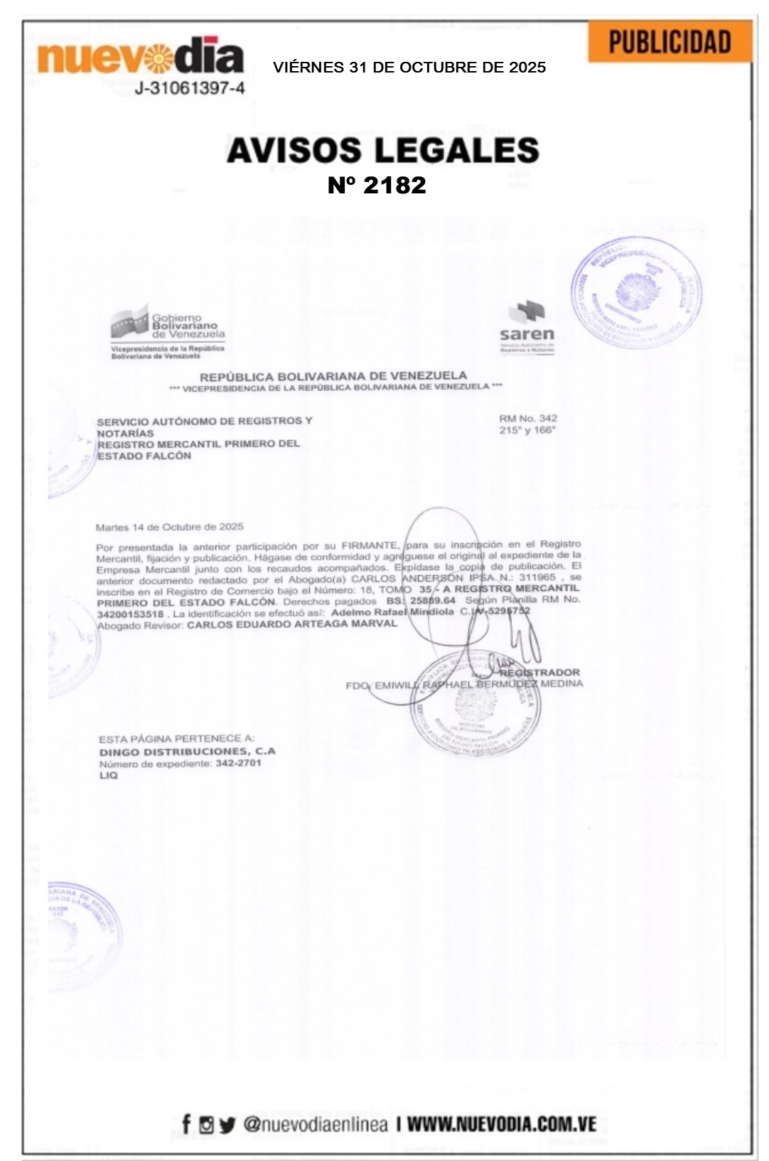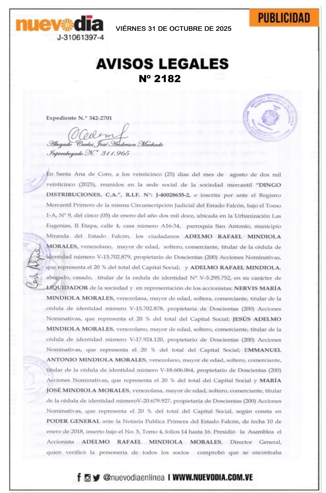 InicioSin categoria Sin categoria Acta Asamblea (Liquidación Definitiva).Dingo Distribuciones,C.A. 31/10/2025 FacebookTwitterPinterestWhatsApp 2182. 31-10-2025 Cuota FacebookTwitterPinterestWhatsApp Artículo anteriorSalió de Bonaire aeronave neutralizada por la FANB, reportan dos fallecidosArtículo siguienteFalleció Hilda Fuenmayor, actriz de Radio Rochela Mercadeo NuevoDia Noticias Relacionadas Sin categoria Edicto.Maritza Hernández de Urdaneta. Sin categoria Acta de Reparo.Cristina Andriolo Santos. Destacadas Lluvias en Venezuela | Este 26-Oct se esperan fuertes precipitaciones Redes Sociales20,299FansMe gusta112,425SeguidoresSeguir4,600SuscriptoresSuscribirte Últimas noticias Destacadas Solicitan retirar nacionalidad de Yon Goicochea por «vendepatria» Destacadas Buscan a seis pescadores desaparecidos, zarparon a principios de semana Cargar más