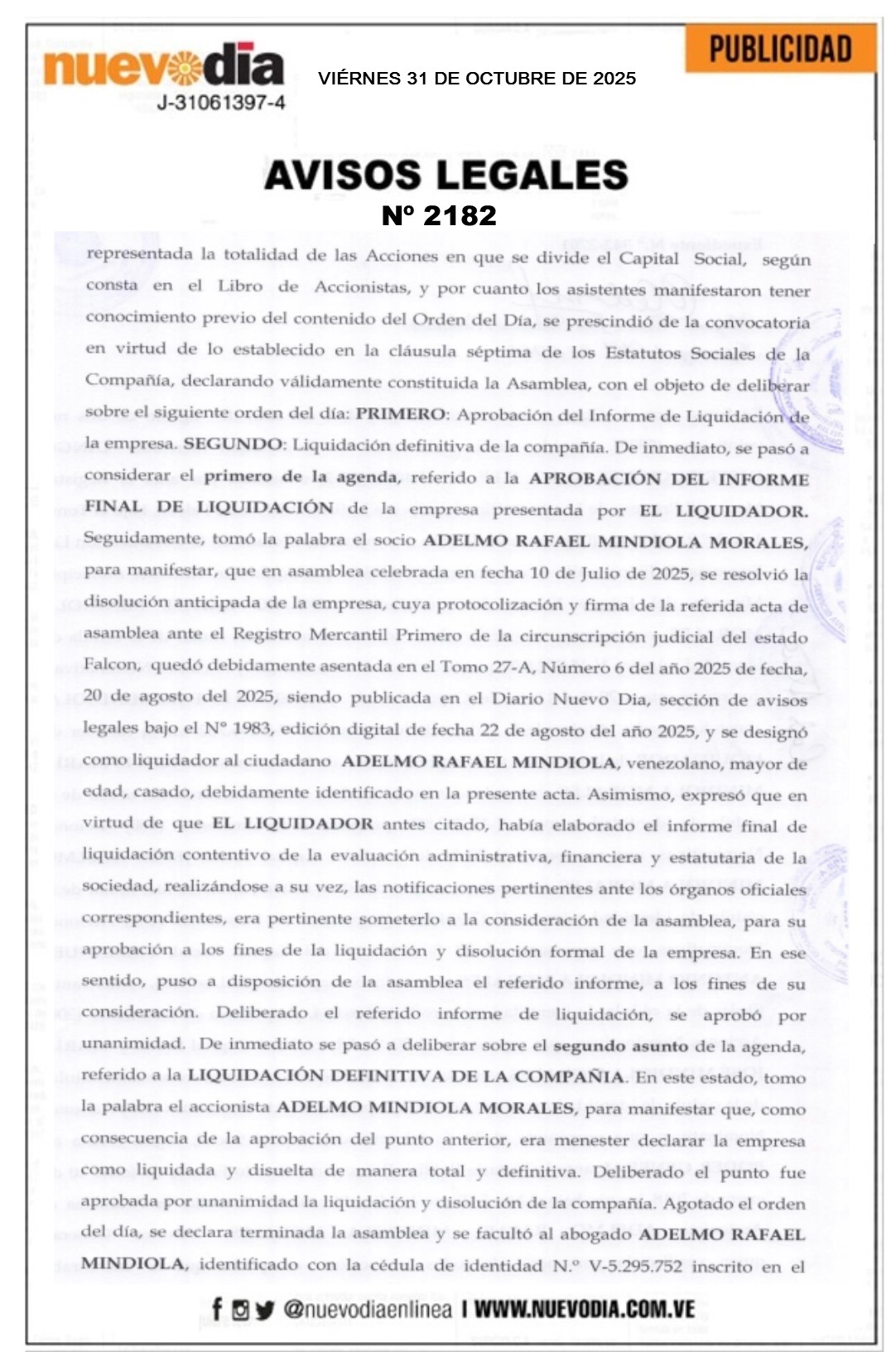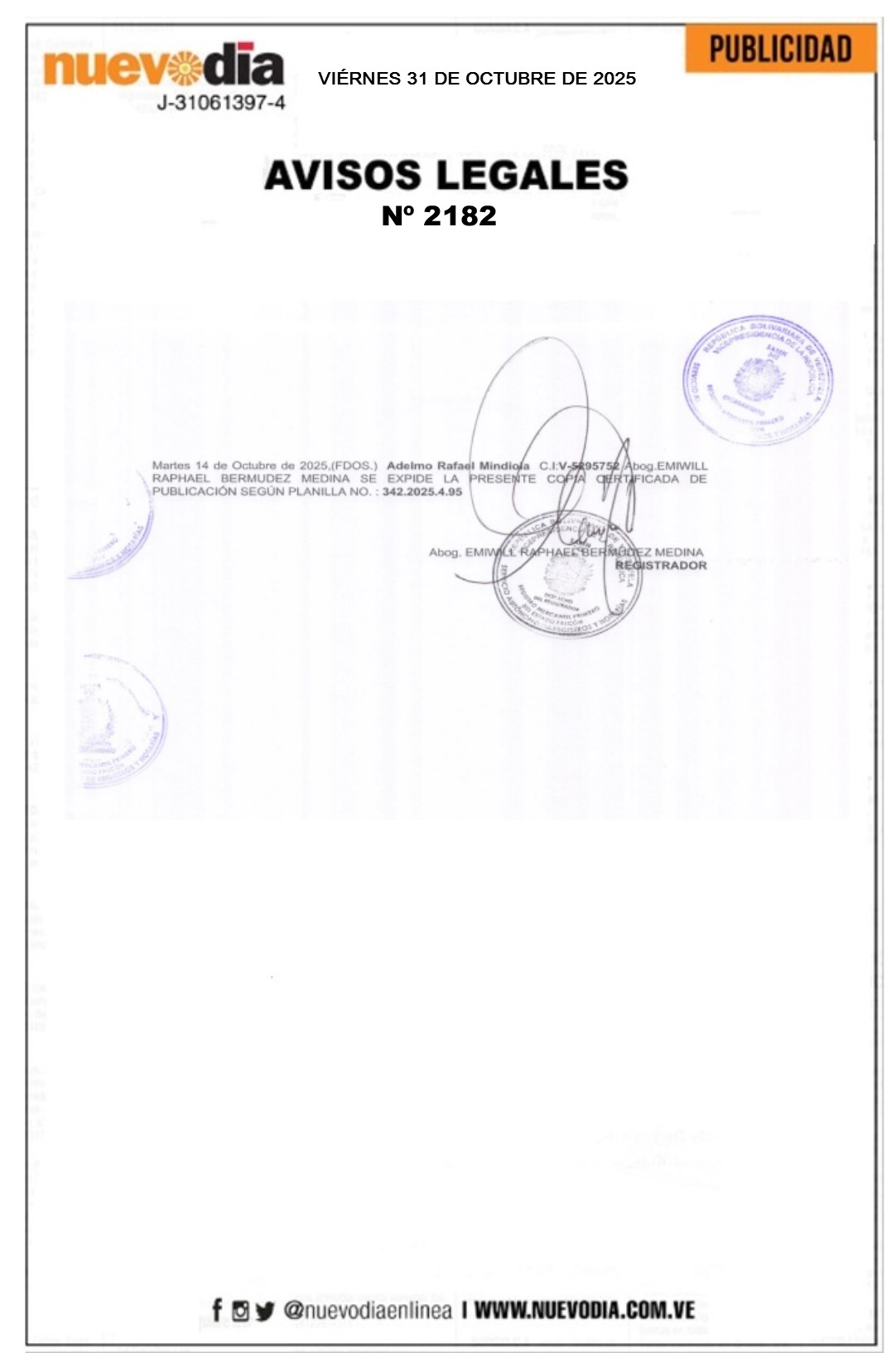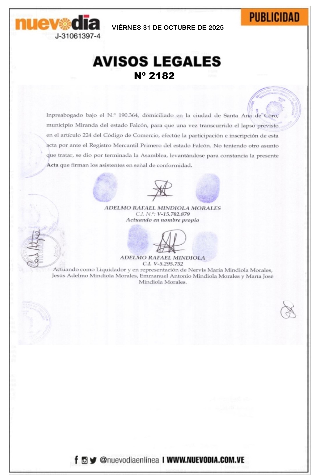 InicioSin categoria Sin categoria Acta Asamblea (Liquidación Definitiva).Dingo Distribuciones,C.A. 31/10/2025 FacebookTwitterPinterestWhatsApp 2182. 31-10-2025 Cuota FacebookTwitterPinterestWhatsApp Artículo anteriorSalió de Bonaire aeronave neutralizada por la FANB, reportan dos fallecidosArtículo siguienteFalleció Hilda Fuenmayor, actriz de Radio Rochela Mercadeo NuevoDia Noticias Relacionadas Sin categoria Edicto.Maritza Hernández de Urdaneta. Sin categoria Acta de Reparo.Cristina Andriolo Santos. Destacadas Lluvias en Venezuela | Este 26-Oct se esperan fuertes precipitaciones Redes Sociales20,299FansMe gusta112,425SeguidoresSeguir4,600SuscriptoresSuscribirte Últimas noticias Destacadas Solicitan retirar nacionalidad de Yon Goicochea por «vendepatria» Destacadas Buscan a seis pescadores desaparecidos, zarparon a principios de semana Cargar más