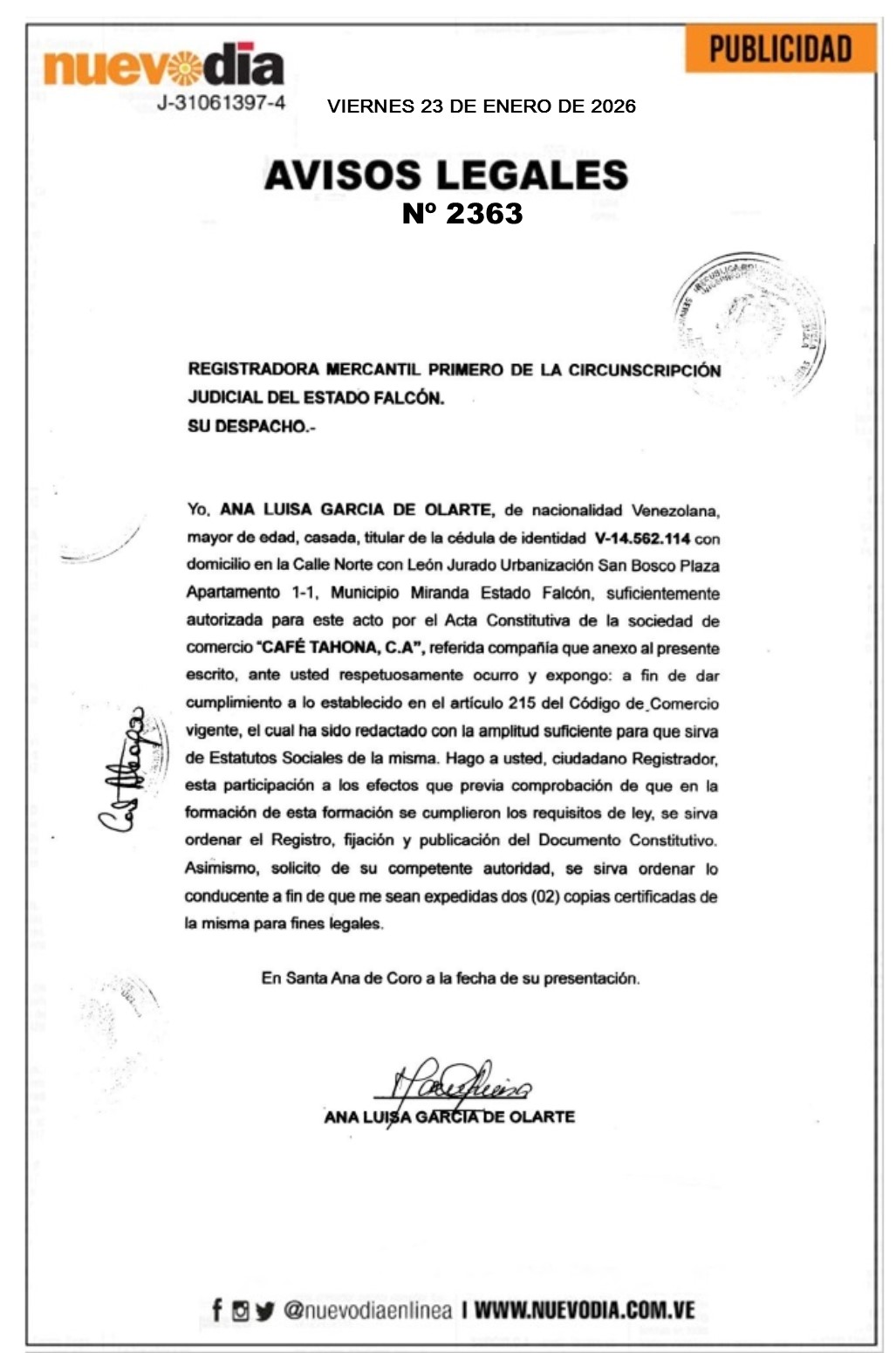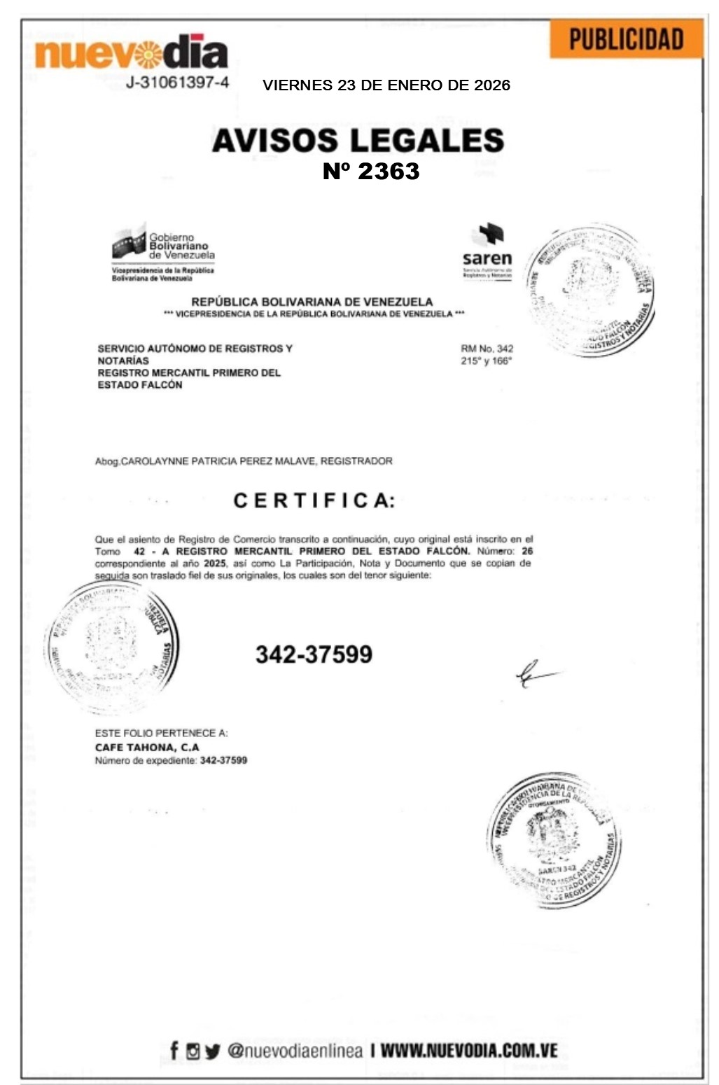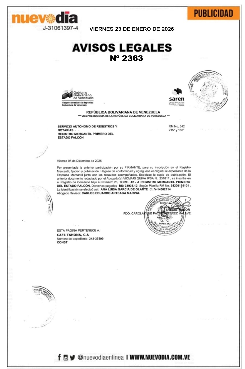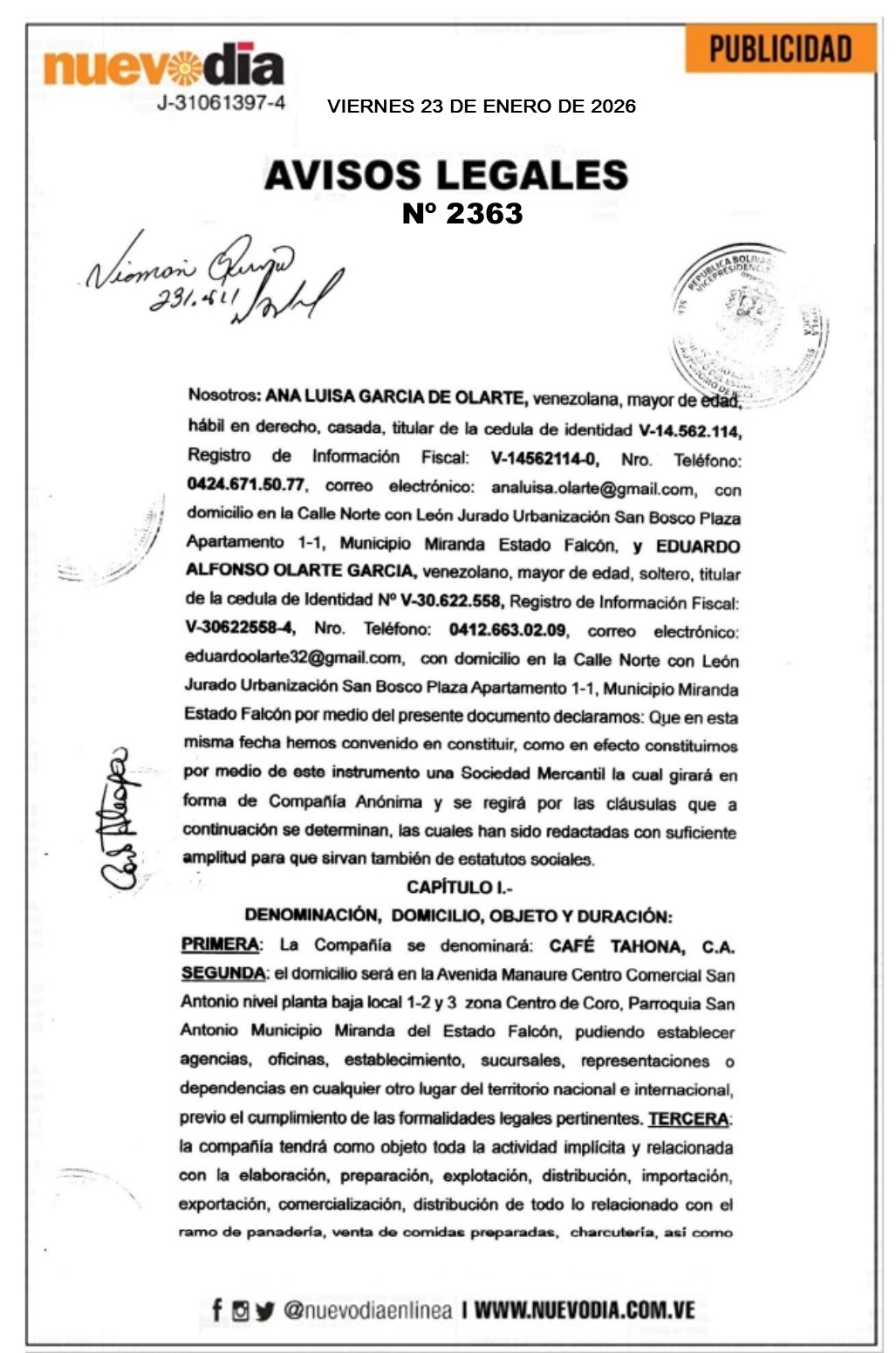 InicioSin categoria Sin categoria Acta Constitutiva.Café Tahona.C.A. 23/01/2026 FacebookTwitterPinterestWhatsApp 2363. 23-01-2026 Cuota FacebookTwitterPinterestWhatsApp Artículo anteriorAutopsias certifican que los 45 fallecidos en Adamuz murieron todos «en el acto»Artículo siguienteCICPC | Murió niña tras golpiza propinada por su madre Mercadeo NuevoDia Noticias Relacionadas Sin categoria Registro Mercantil.Bicess Servicios Multiples.C.A. Sin categoria Pescadores debatieron propuestas para elevar al Poder Constituyente Sin categoria Edicto.José Gregorio Loyo Leal. Redes Sociales20,299FansMe gusta112,425SeguidoresSeguir4,600SuscriptoresSuscribirte Últimas noticias Destacadas Falleció el periodista Walter Martínez este jueves 22-Ene Destacadas Llegaron al país 183 connacionales desde Estados Unidos Cargar más