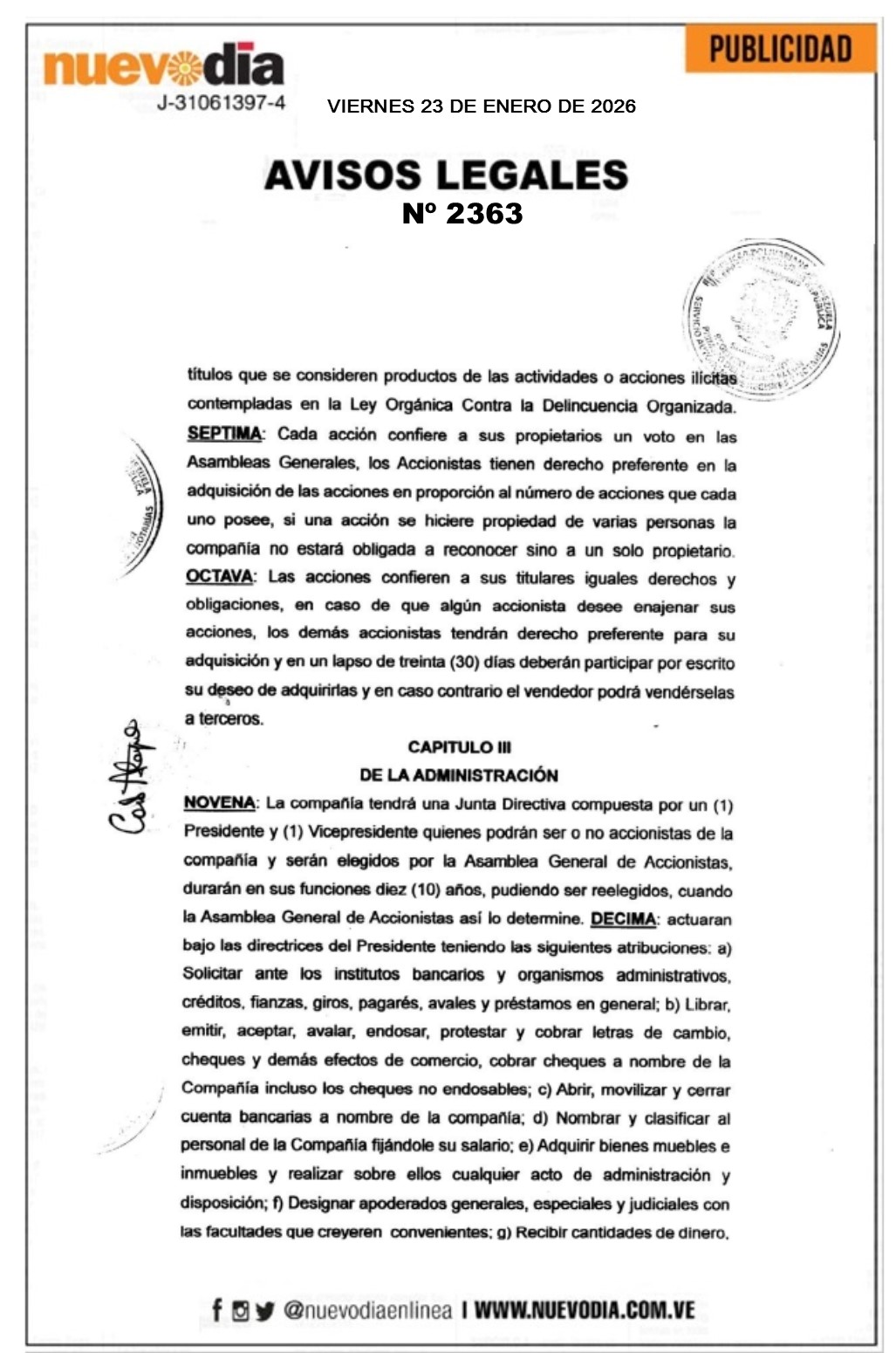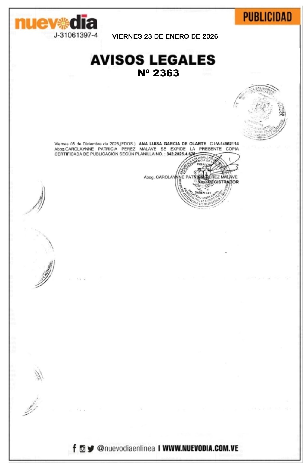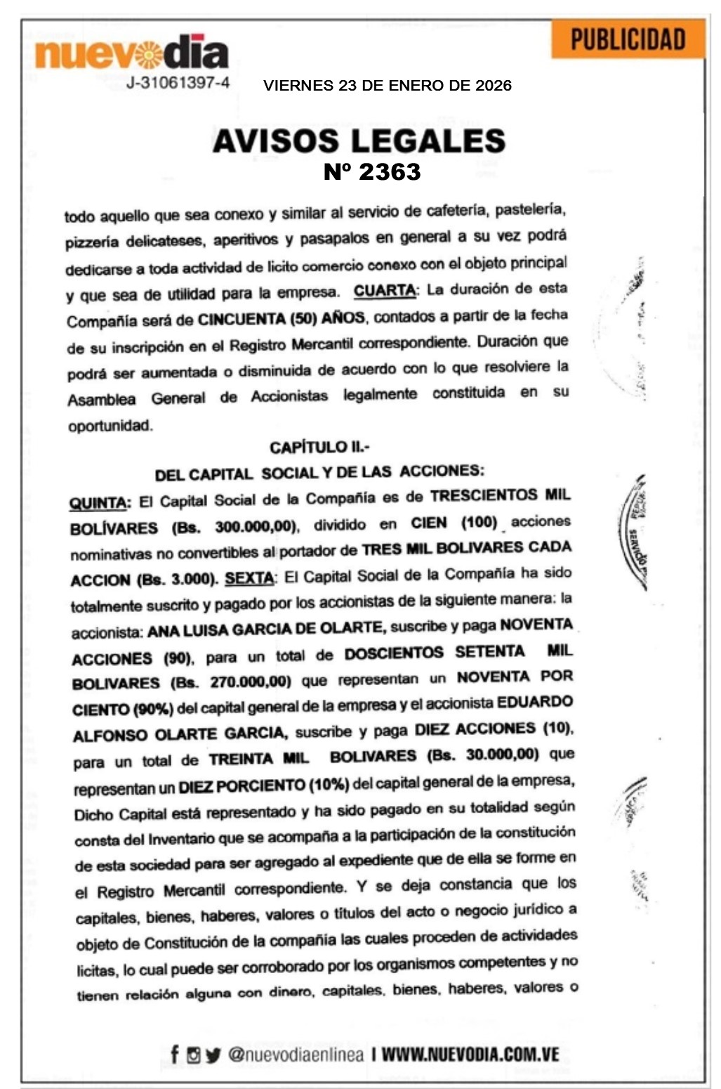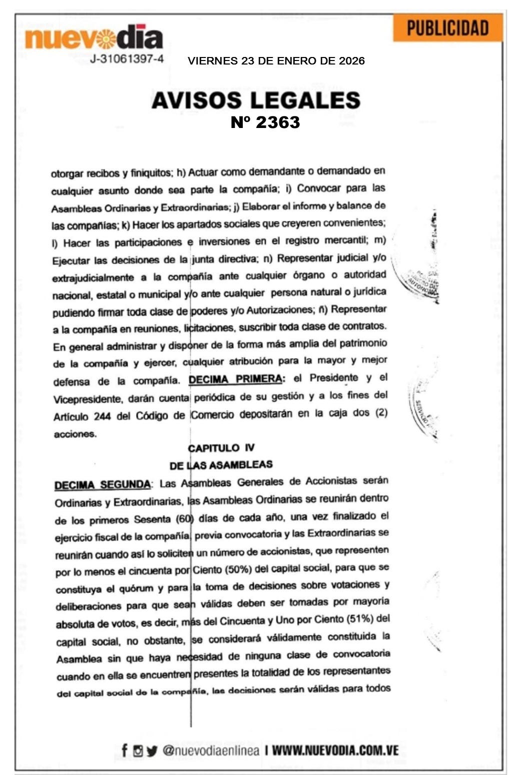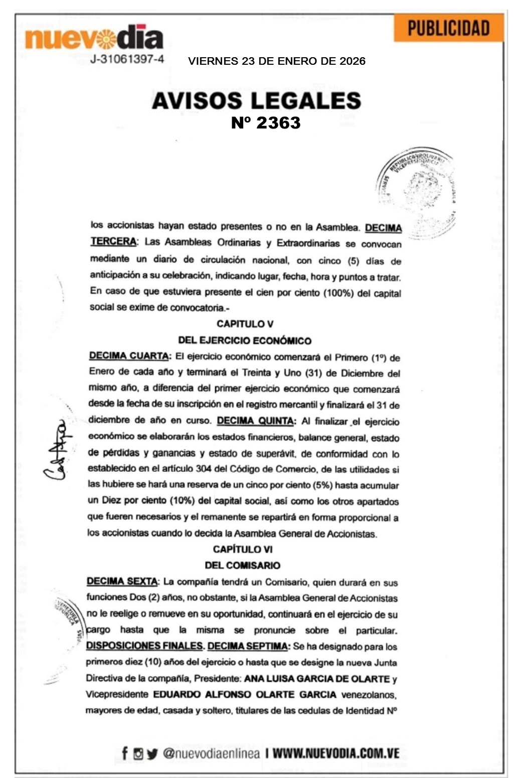 InicioSin categoria Sin categoria Acta Constitutiva.Café Tahona.C.A. 23/01/2026 FacebookTwitterPinterestWhatsApp 2363. 23-01-2026 Cuota FacebookTwitterPinterestWhatsApp Artículo anteriorAutopsias certifican que los 45 fallecidos en Adamuz murieron todos «en el acto»Artículo siguienteCICPC | Murió niña tras golpiza propinada por su madre Mercadeo NuevoDia Noticias Relacionadas Sin categoria Registro Mercantil.Bicess Servicios Multiples.C.A. Sin categoria Pescadores debatieron propuestas para elevar al Poder Constituyente Sin categoria Edicto.José Gregorio Loyo Leal. Redes Sociales20,299FansMe gusta112,425SeguidoresSeguir4,600SuscriptoresSuscribirte Últimas noticias Destacadas Falleció el periodista Walter Martínez este jueves 22-Ene Destacadas Llegaron al país 183 connacionales desde Estados Unidos Cargar más