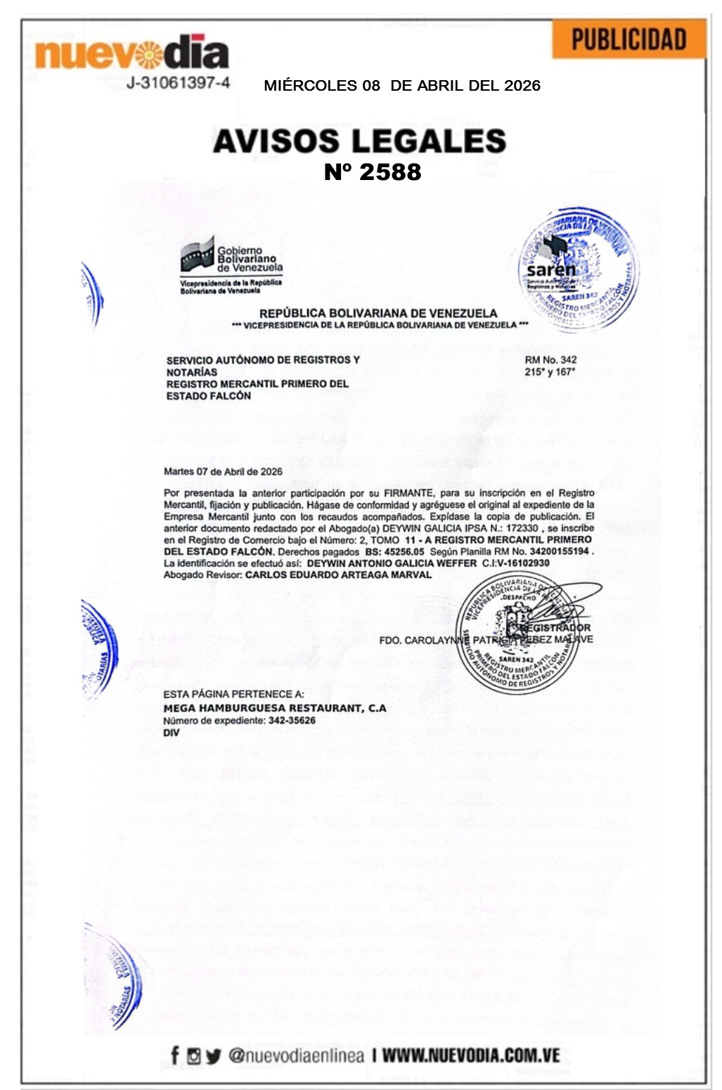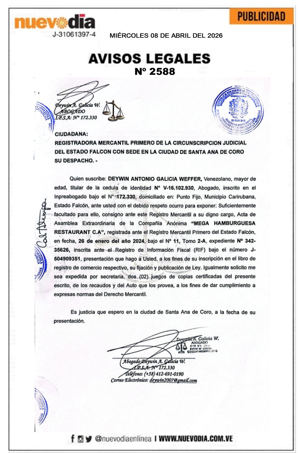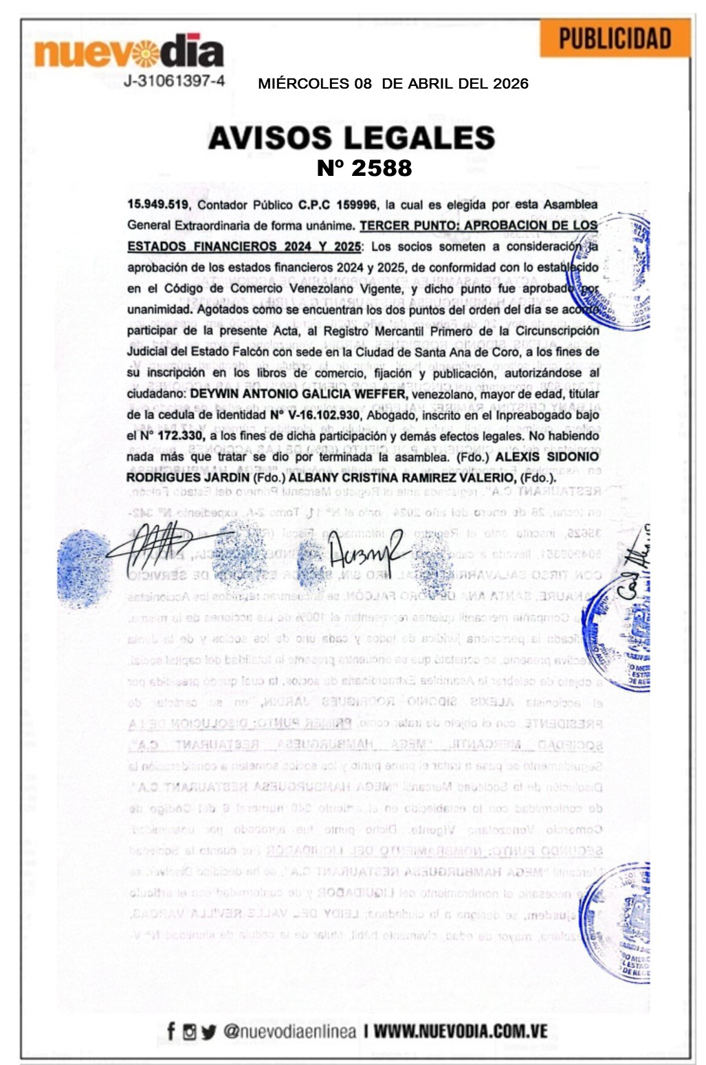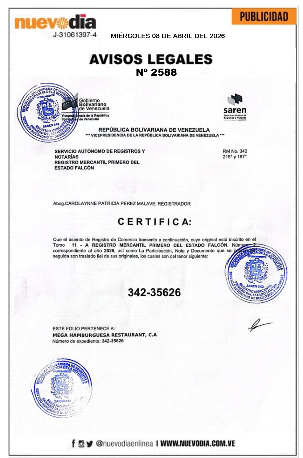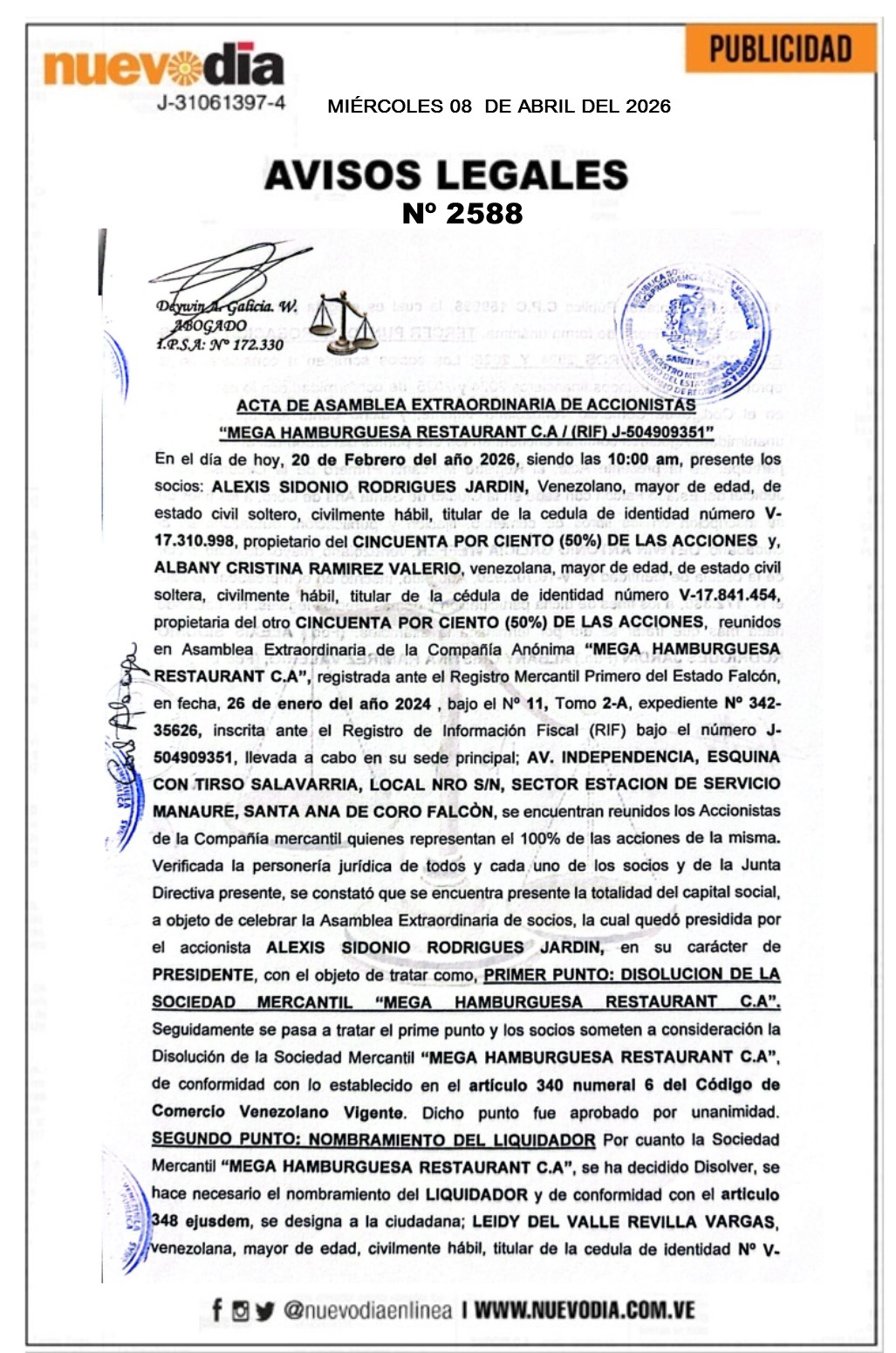 Acta de Asamblea Extraordinaria.Mega Hamburguesa Restaurant.C.A.