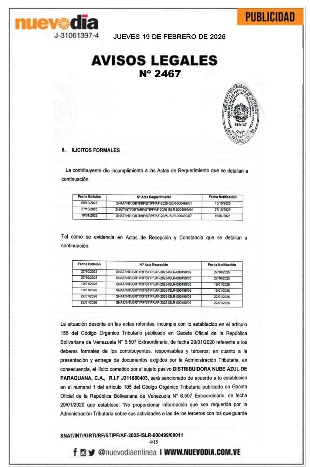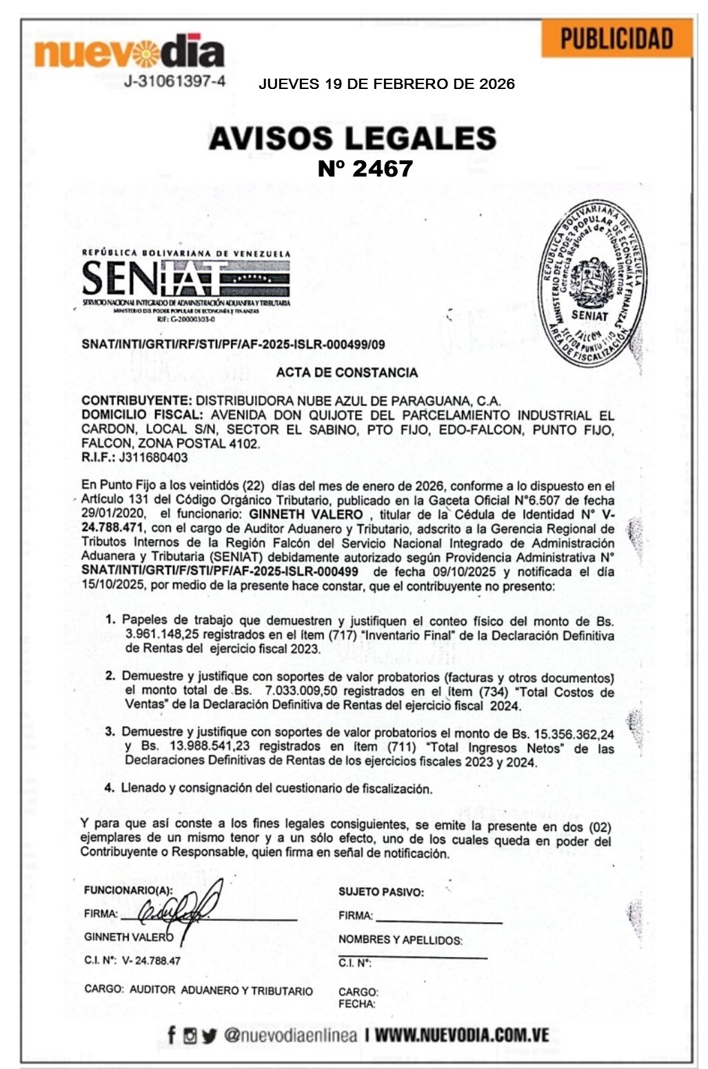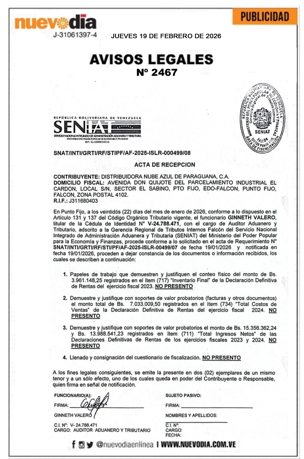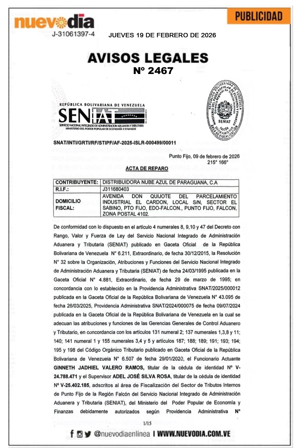 Acta de Reparo,Recepción y Constancia.Distribuidora Nube Azul de Paraguaná.C.A.