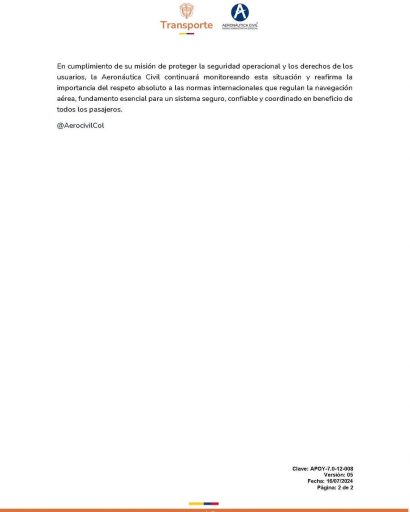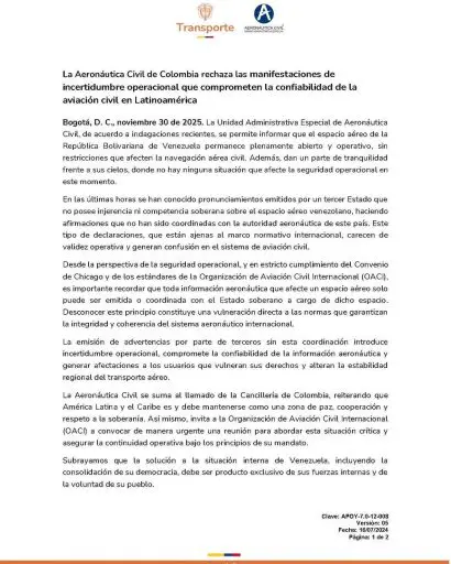 Según lo expresado en un comunicado oficial, la autoridad aérea colombiana confirmó que actualmente no existe ninguna situación que afecte la seguridad operacional. Asimismo, mencionó los recientes pronunciamientos de un tercer Estado que carece de competencia soberana e injerencia sobre el espacio aéreo de Venezuela. Estas declaraciones, al margen del marco normativo internacional, no tienen validez operativa y pueden generar confusión dentro del sistema de aviación civil.