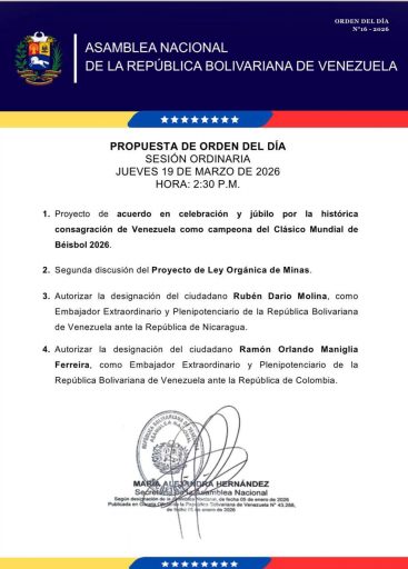 Además, se presentará el proyecto de acuerdo en celebración y júbilo por la histórica consagración de Venezuela como campeona del Clásico Mundial de Beisbol 2026.