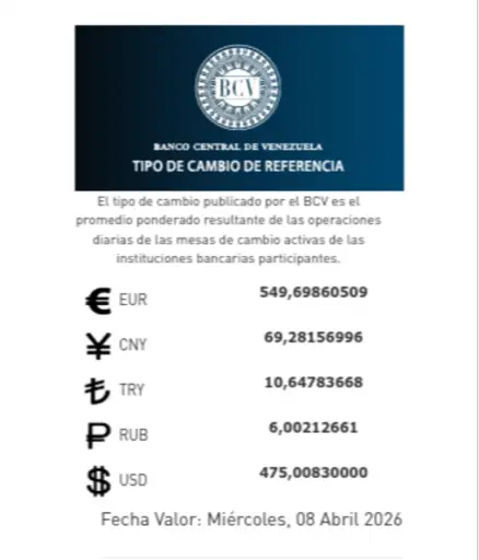 El Banco Central de Venezuela (BCV) informó que, el martes 7 de abril, el precio del dólar oficial (USD) cerró en 475,00 bolívares. Esta tasa será aplicable durante toda la jornada del miércoles 8 de abril en las transacciones comerciales, financieras y contables realizadas en el país.