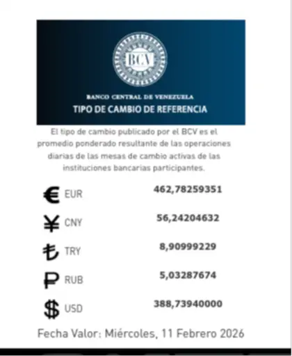 El Banco Central de Venezuela (BCV) estableció el precio el dólar oficial, así como el del euro, que estarán vigentes el miércoles 11 de febrero. Ambas tasas oficiales reflejan un ligero incremento en comparación con el cierre anterior.