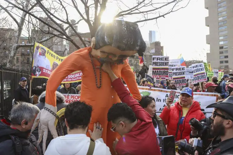 Del otro lado, también se escuchaban gritos en rechazo a Nicolás Maduro. En el sitio también se observó un muñeco gigante vestido con un traje naranja de prisionero y con las manos atadas.