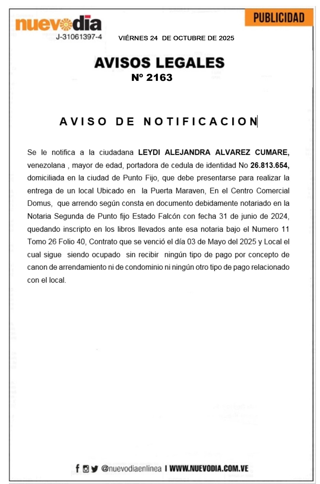 InicioPublicidadLegales PublicidadLegales Aviso de Notificación:Leydi Alejandra Alvarez Cumare. 24/10/2025 FacebookTwitterPinterestWhatsApp 2163. 24-10-2025 Cuota FacebookTwitterPinterestWhatsApp Artículo anteriorVenezuela de béisbol sub-23 a un triunfo del Campeonato PanamericanoArtículo siguienteEdicto.Alida María González de Primera. Mercadeo NuevoDia Noticias Relacionadas Legales Edicto.Alberto Antonio Gómez Martínez. Legales Edicto.Alida María González de Primera. Legales Cartel de Citación.Giovanny Antonio Pantaleon Baptista. Redes Sociales20,299FansMe gusta112,425SeguidoresSeguir4,600SuscriptoresSuscribirte Últimas noticias Destacadas Presidente Maduro anunció que los ejercicios militares seguirán por 72 horas más Destacadas Precio del dólar, así se cotiza este viernes 24-Oct Cargar más