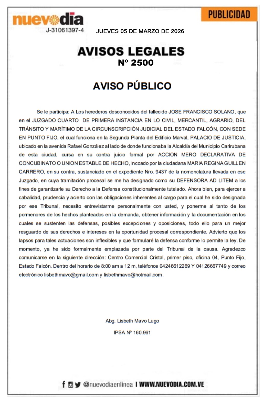InicioPublicidadLegales PublicidadLegales Aviso Público.José Francisco Solano. 05/03/2026 FacebookTwitterPinterestWhatsApp 2500. 05-03-2026 Cuota FacebookTwitterPinterestWhatsApp Artículo anteriorPortada jueves 05 de marzo de 2026Artículo siguienteEdicto.Virgilio José Osteicoechea Martínez,Yaritza Osteicoechea Petit y José Virgilio Osteicoechea Petit. Mercadeo NuevoDia Noticias Relacionadas Legales Edicto.Virgilio José Osteicoechea Martínez,Yaritza Osteicoechea Petit y José Virgilio Osteicoechea Petit. Legales Cartel de Citación.Rommelt Alexander Amaya Law y Solsire del Valle Mendoza Hidalgo. Legales Cartel de Citación.Panadería, Pastelería y Variedades Virgen del Camino.C.A. Redes Sociales20,299FansMe gusta112,425SeguidoresSeguir4,600SuscriptoresSuscribirte Últimas noticias Destacadas Presidenta encargada entregará a la AN una ampliación de la Ley de Minas Destacadas Guanipa pide levantar inhabilitaciones a toda la dirigencia opositora Cargar más
