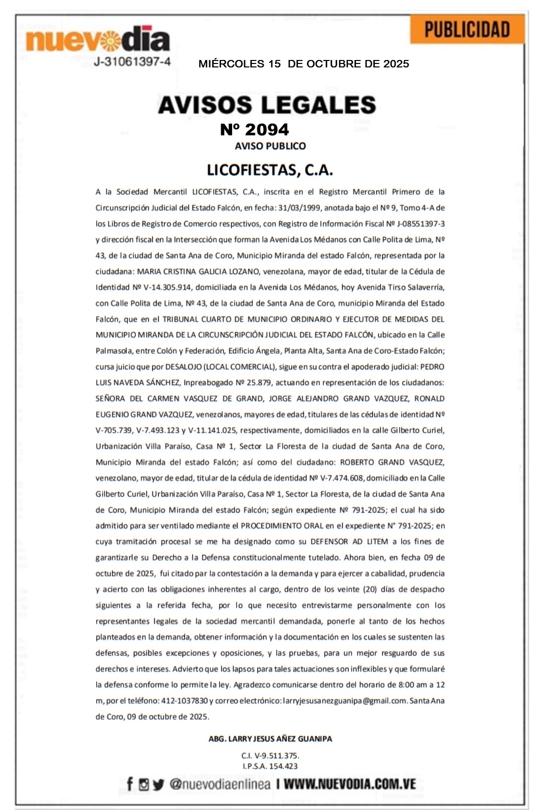 InicioPublicidadLegales PublicidadLegales Aviso Público.Licofiestas, C.A. 15/10/2025 FacebookTwitterPinterestWhatsApp 2094. 15-10-2025 Cuota FacebookTwitterPinterestWhatsApp Artículo anteriorEste es el precio del dólar para hoy 15-OctArtículo siguienteDespliegan fuerzas militares y policiales en Caracas y Miranda Mercadeo NuevoDia Noticias Relacionadas Legales Edicto.Domingo García Ruíz. Legales Edicto.Rosa Margarita Sánchez de Jiménez. Legales Segunda Convocatoria.Propietarios del Condominio Complejo Caribbean Marina & Beach Club. Redes Sociales20,299FansMe gusta112,425SeguidoresSeguir4,600SuscriptoresSuscribirte Últimas noticias Destacadas Despliegan fuerzas militares y policiales en Caracas y Miranda Destacadas Este es el precio del dólar para hoy 15-Oct Cargar más