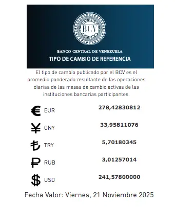 El precio del dólar BCV al 21 de noviembre de 2025 publicada por el Banco Central de Venezuela (BCV) se fijó en 241,578 Bs/USD presentando un incremento de Bs. +1,2571 (+0,5231%) con respecto a la jornada anterior.