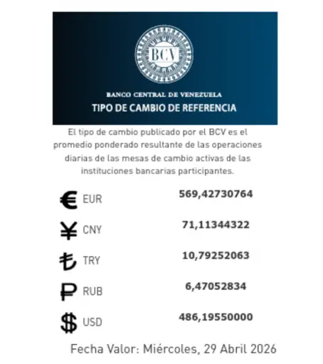 El precio del dólar fijado por el Banco Central de Venezuela (BCV) correspondiente al 29 de abril de 2026 se estableció en 486,1955 bolívares por unidad.