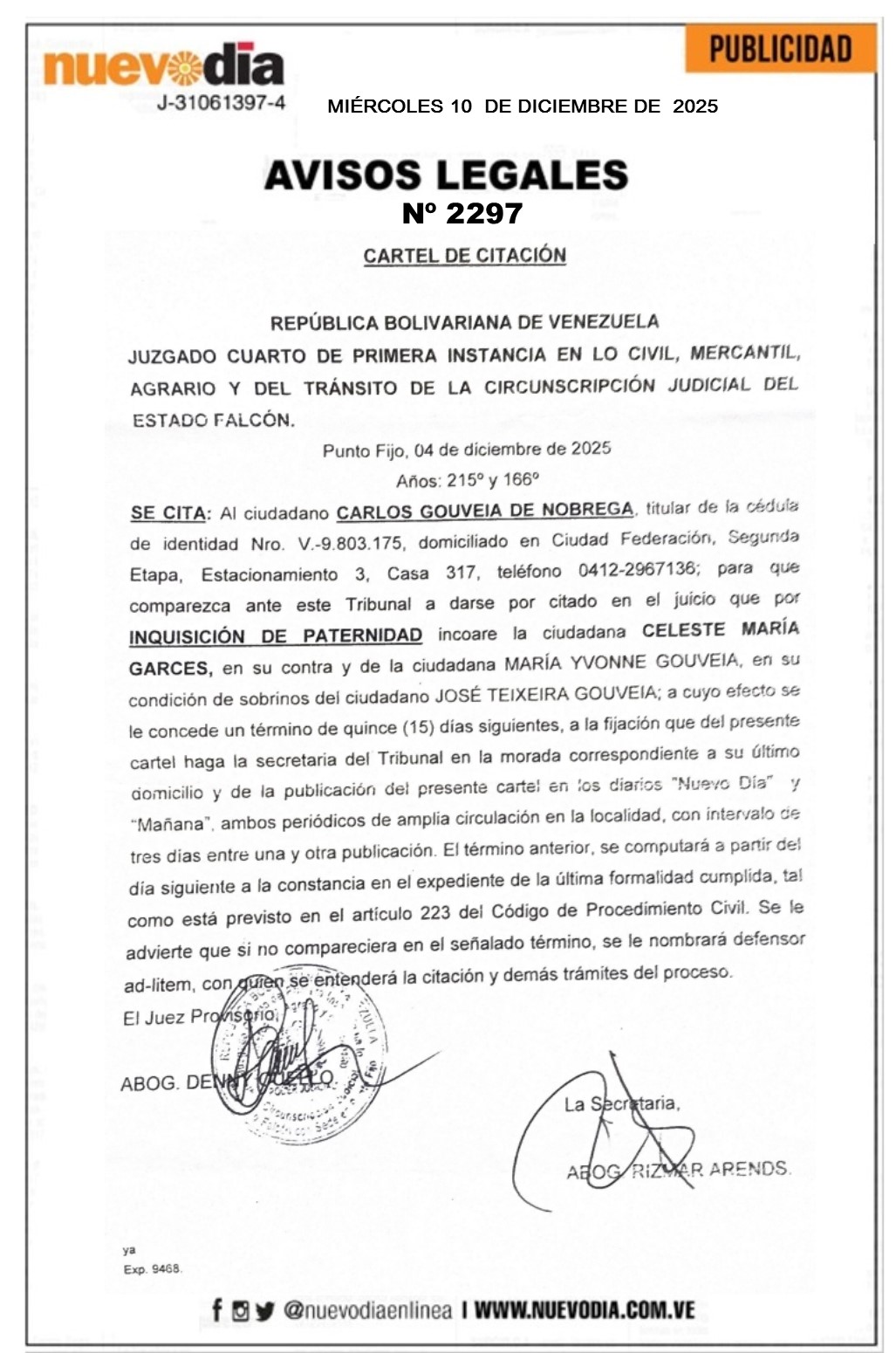 InicioPublicidadLegales PublicidadLegales Cartel de Citación.Carlos Gouveia de Nobrega. 10/12/2025 FacebookTwitterPinterestWhatsApp 2297. 10-12-2025 Cuota FacebookTwitterPinterestWhatsApp Artículo anteriorLa hija de María Corina Machado recibe el Nobel de la Paz en su nombreArtículo siguienteCICPC rescató cuatro adolescente de red de trata de personas Mercadeo NuevoDia Noticias Relacionadas Legales Edicto.Julio Segundo Noroño Torres. Legales Edicto.Victor Manuel Alvarez Cossi. Legales Edicto.Antonio José Chirino Lugo y Jorge Federico Chirinos Lugo. Redes Sociales20,299FansMe gusta112,425SeguidoresSeguir4,600SuscriptoresSuscribirte Últimas noticias Destacadas Arquidiócesis de Caracas y CEV se solidarizan con el cardenal Baltazar Porras Destacadas Delcy Rodríguez: «En Noruega asistieron a un velorio. El show fracasó» Cargar más