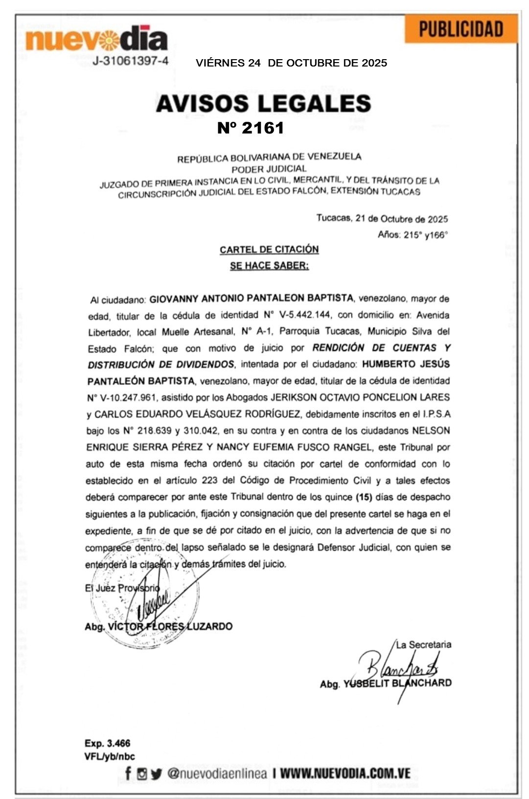 InicioPublicidadLegales PublicidadLegales Cartel de Citación.Giovanny Antonio Pantaleon Baptista. 24/10/2025 FacebookTwitterPinterestWhatsApp 2161. 24-10-2025 Cuota FacebookTwitterPinterestWhatsApp Artículo anteriorEdicto.Elida Rosa Rodríguez de Penso.Artículo siguientePrecio del dólar, así se cotiza este viernes 24-Oct Mercadeo NuevoDia Noticias Relacionadas Legales Edicto.Elida Rosa Rodríguez de Penso. Legales Edicto.Flora Beatriz Loyo de Toyo, José Angel Toyo Acosta, José Antonio Toyo Loyo, Jésus Israel Toyo Loyo, Yoel Rafael Toyo Loyo, Henry Gregorio Toyo... Legales Cartel de Notificación.Automercado Virgen del Carmen, C.A. Redes Sociales20,299FansMe gusta112,425SeguidoresSeguir4,600SuscriptoresSuscribirte Últimas noticias Destacadas Presidente Maduro anunció que los ejercicios militares seguirán por 72 horas más Destacadas Precio del dólar, así se cotiza este viernes 24-Oct Cargar más