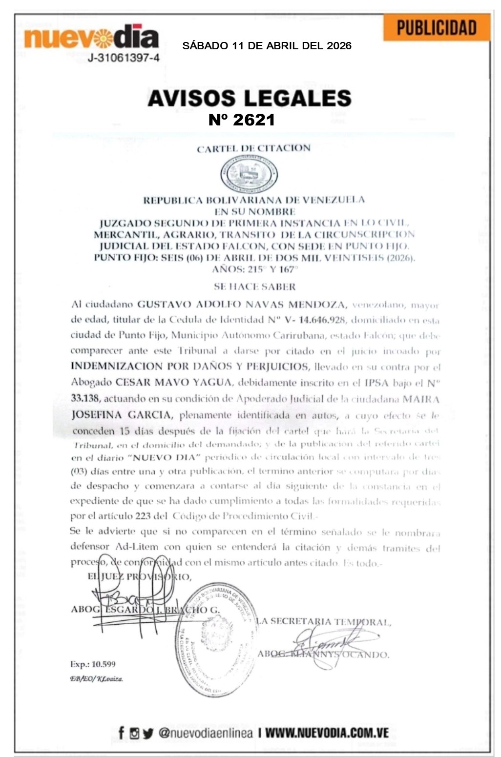InicioPublicidadLegales PublicidadLegales Cartel de Citación.Gustavo Adolfo Navas Mendoza. 11/04/2026 FacebookTwitterPinterestWhatsApp 2621. 11-04-2026 Cuota FacebookTwitterPinterestWhatsApp Artículo anteriorComuna rehabilita CDI «Dr. Ignacio Bravo» en Pueblo Nuevo de la SierraArtículo siguienteEdicto.Gregorio Sánchez Redondo Arellano. Mercadeo NuevoDia Noticias Relacionadas Legales Edicto.Gregorio Sánchez Redondo Arellano. Legales Edicto.Marba Nahairobis Roque Gotopo. Legales Acta de Asamblea Extraodinaria.Mundo Motor’s 2024.C.A. Redes Sociales20,299FansMe gusta112,425SeguidoresSeguir4,600SuscriptoresSuscribirte Últimas noticias Destacadas Maestros entregan propuestas para recuperar ingreso económico al ministro Rodríguez Destacadas Así quedaron las tarifas de los peajes tras nuevo aumento Cargar más