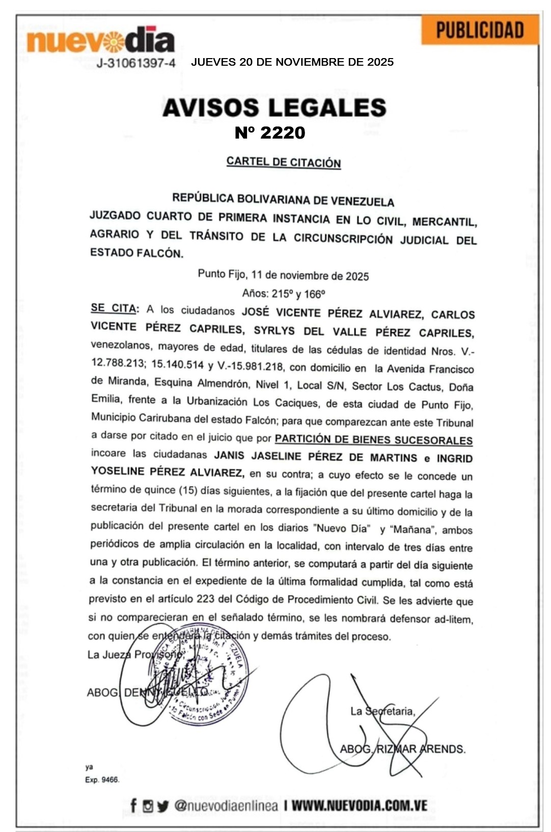 InicioPublicidadLegales PublicidadLegales Cartel de Citación.José Vicente Pérez Alviarez, Carlos Vicente Pérez Capriles, Syrlys del Valle Pérez Capriles. 20/11/2025 FacebookTwitterPinterestWhatsApp 2220. 20-11-2025 Cuota FacebookTwitterPinterestWhatsApp Artículo anteriorPortada jueves 20 de noviembre de 2025Artículo siguienteEdicto.Morella Ramírez de Lanz. Mercadeo NuevoDia Noticias Relacionadas Legales Edicto.Morella Ramírez de Lanz. Legales Cartel de Notificación.Inversiones Big Mar.C.a. Legales Cartel de Notificación.Inversiones Big Mar.C.A. Redes Sociales20,299FansMe gusta112,425SeguidoresSeguir4,600SuscriptoresSuscribirte Últimas noticias Destacadas BCV | Así está el precio del dólar hoy en Venezuela Destacadas FANB despliega material electoral para la Cuarta Consulta Popular Cargar más