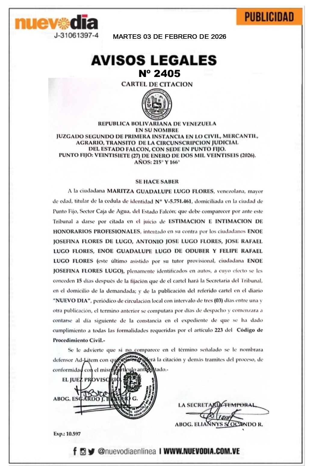 InicioPublicidadLegales PublicidadLegales Cartel de Citación.Maritza Guadalupe Lugo Flores. 03/02/2026 FacebookTwitterPinterestWhatsApp 2405. 03-02-2026 Cuota FacebookTwitterPinterestWhatsApp Artículo anteriorBill y Hillary Clinton testificarán por el caso EpsteinArtículo siguienteEdicto.Reyna Dinorah Rojas Romero. Mercadeo NuevoDia Noticias Relacionadas Legales Acta Asamblea Extraordinaria.Centro Odontológico Salud Dent.C.A. Legales Edicto.Reyna Dinorah Rojas Romero. Legales Convocatoria.Accionistas de la Sociedad Mercantil «Cliver Barber Shop».C.A. Redes Sociales20,299FansMe gusta112,425SeguidoresSeguir4,600SuscriptoresSuscribirte Últimas noticias Destacadas Laura Dogu: trabajaré «mano a mano» con los venezolanos Destacadas Precio del dólar oficial subió 0,50 %, así se cotiza hoy 3-Feb Cargar más