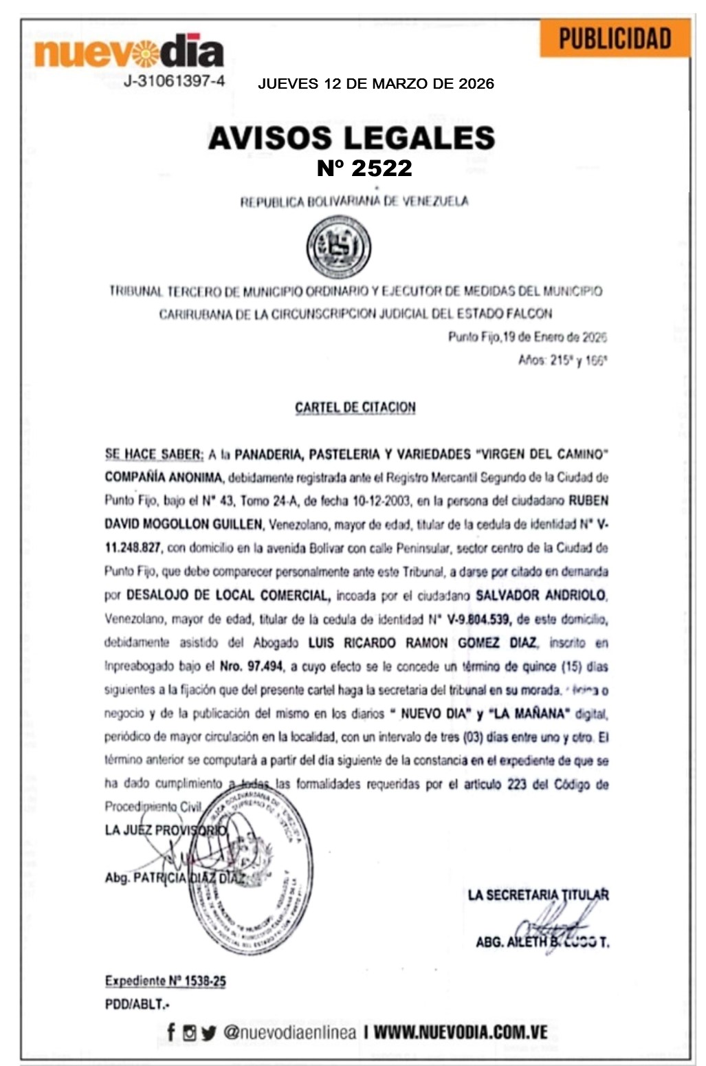 InicioPublicidadLegales PublicidadLegales Cartel de Citación.Panadería, Pastelería y Variedades Virgen del Camino.C.A. 12/03/2026 FacebookTwitterPinterestWhatsApp 2522. 12-03-2026 Cuota FacebookTwitterPinterestWhatsApp Artículo anteriorConoce la propuesta de salario de la Central Bolivariana Socialista de TrabajadoresArtículo siguienteEdicto.Virgilio José Osteicoechea Martínez,Yaritza Osteicoechea Petit y José Virgilio Osteicoechea Petit. Mercadeo NuevoDia Noticias Relacionadas Legales Edicto.Virgilio José Osteicoechea Martínez,Yaritza Osteicoechea Petit y José Virgilio Osteicoechea Petit. Legales Notificación.Victor González. Legales Edicto.María Elisa López de Sarmiento. Redes Sociales20,299FansMe gusta112,425SeguidoresSeguir4,600SuscriptoresSuscribirte Últimas noticias Destacadas Conoce la propuesta de salario de la Central Bolivariana Socialista de Trabajadores Destacadas Paula Henao es designada nueva ministra de Hidrocarburos Cargar más