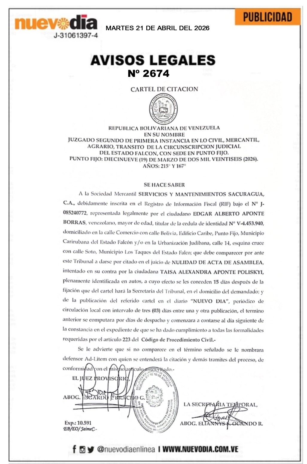Cartel de Citación.Servicios y Mantenimientos Sacuragua.C.A.