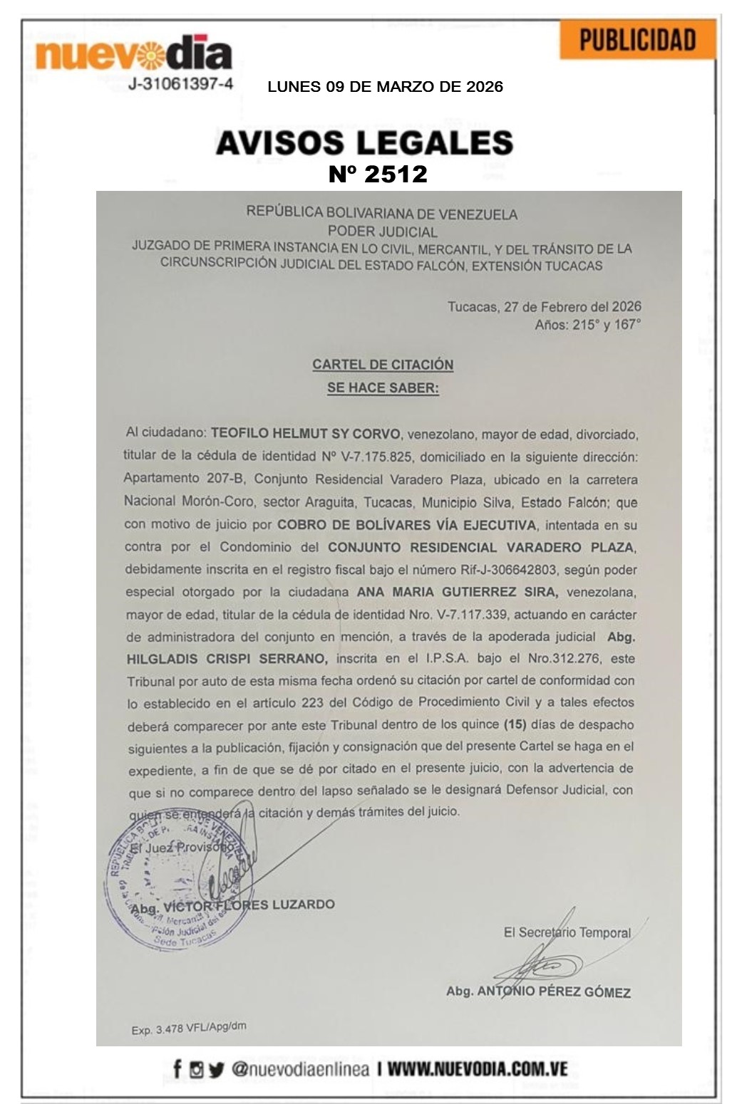 InicioPublicidadLegales PublicidadLegales Cartel de Citación.Teofilo Helmut Sy Corvo. 09/03/2026 FacebookTwitterPinterestWhatsApp 2512. 09-03-2026 Cuota FacebookTwitterPinterestWhatsApp Artículo anteriorCartel de Citación.Marwan Fayez Fayez.Artículo siguienteTrump se pronuncia sobre la elección del nuevo líder supremo de Irán Mercadeo NuevoDia Noticias Relacionadas Legales Cartel de Citación.Marwan Fayez Fayez. Legales Cartel de Citación.Marleni Alfonzo Arteaga. Legales Cartel de Citación.César J. Duran Rosales. Redes Sociales20,299FansMe gusta112,425SeguidoresSeguir4,600SuscriptoresSuscribirte Últimas noticias Destacadas Juan Pablo Guanipa confirma cierre de su causa por terrorismo Destacadas Luigi Pisella: «Las sanciones causaron mucho daño, pero crecimos 8,5% en 2025» Cargar más