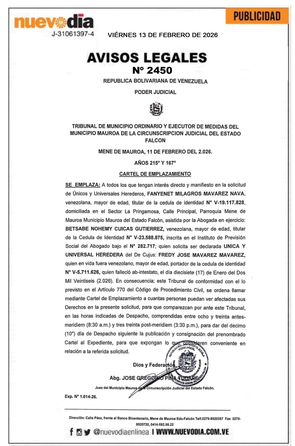 InicioPublicidadLegales PublicidadLegales Cartel de Emplazamiento.Fredy José Mavarez Mavarez. 13/02/2026 FacebookTwitterPinterestWhatsApp 2450. 13-02-2026 Cuota FacebookTwitterPinterestWhatsApp Artículo anteriorDelcy Rodríguez asegura eleciones libres en Venezuela sin anunciar fechaArtículo siguienteSerie de las Américas 2026 | Venezuela y Colombia por el título hoy 13-Feb Mercadeo NuevoDia Noticias Relacionadas Legales Cartel de Intimación.Daniela José Arcaya Mendoza. Legales Edicto.Francisco D’sales Sandoval Rodríguez. Legales Edicto.Edgar Jesús Viera Arias. Redes Sociales20,299FansMe gusta112,425SeguidoresSeguir4,600SuscriptoresSuscribirte Últimas noticias Destacadas Dogu califica de «altamente productiva» reunión entre Delcy Rodríguez y el secretario Wright Destacadas Secretario Wright afirmó antes de partir de Venezuela que «regresaría pronto» Cargar más