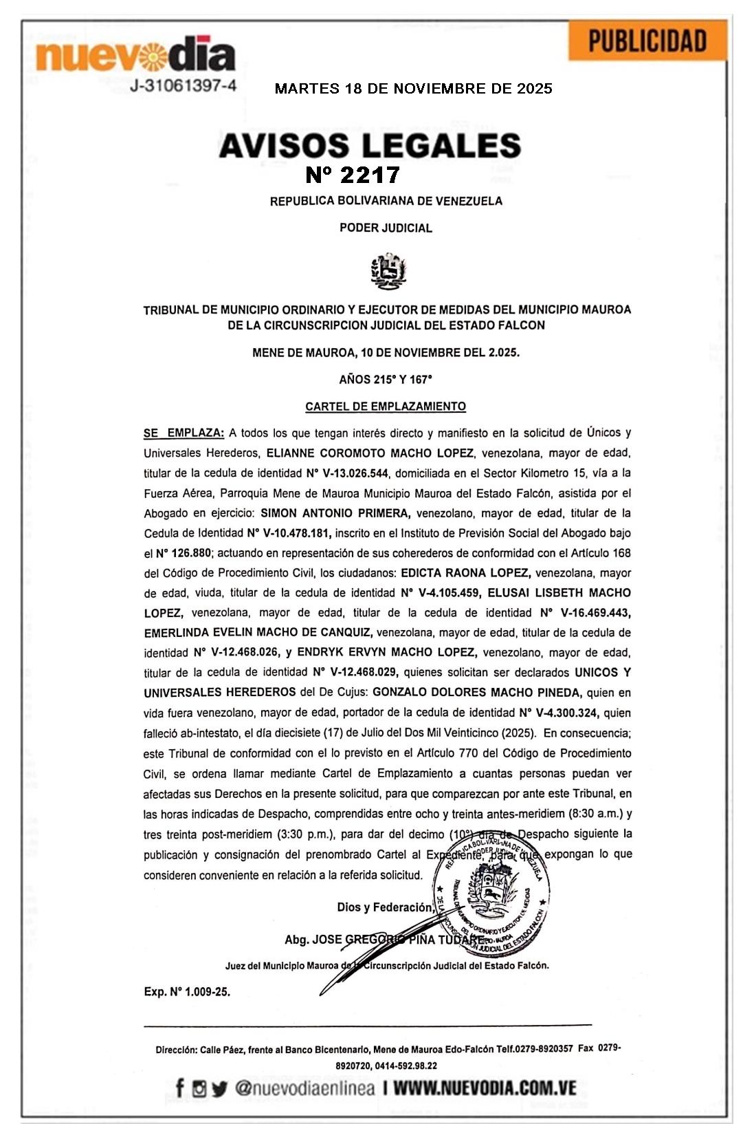 InicioPublicidadLegales PublicidadLegales Cartel de Emplazamiento.Gonzalo Dolores Macho Pineda. 18/11/2025 FacebookTwitterPinterestWhatsApp 2217. 18-11-2025 Cuota FacebookTwitterPinterestWhatsApp Artículo anteriorCartel de Emplazamiento.Melida Raga.Artículo siguienteRevelan verdades que enturbian el Miss Universo 2025 Mercadeo NuevoDia Noticias Relacionadas Legales Cartel de Emplazamiento.Melida Raga. Legales Edicto.José Gregorio Loyo Leal. Legales Edicto.José Vicente Pérez Borjas. Redes Sociales20,299FansMe gusta112,425SeguidoresSeguir4,600SuscriptoresSuscribirte Últimas noticias Destacadas El Zulia se desborda de fe en honor a la Virgen de Chiquinquirá Destacadas Maduro reitera invitación a Trump para un diálogo «cara a cara» Cargar más