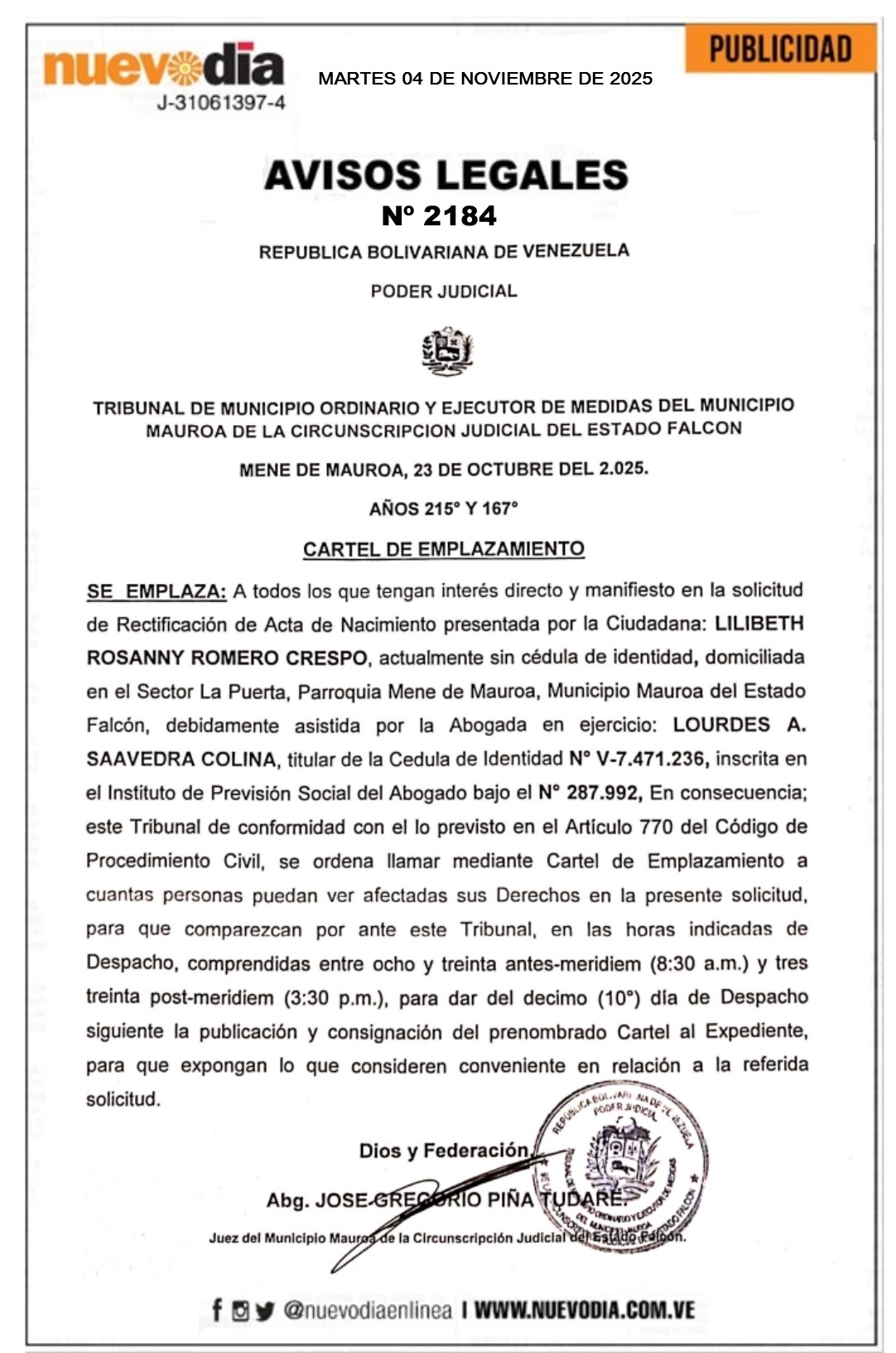 InicioPublicidadLegales PublicidadLegales Cartel de Emplazamiento.Lilibeth Rosanny Romero Crespo. 04/11/2025 FacebookTwitterPinterestWhatsApp 2184. 04-11-2025 Cuota FacebookTwitterPinterestWhatsApp Artículo anteriorPortada martes 4 de noviembre de 2025Artículo siguienteEdicto.José Vicente Pérez Borgas. Mercadeo NuevoDia Noticias Relacionadas Legales Edicto.José Vicente Pérez Borgas. Legales Cartel de Citación.Luís Domingo Montserrat Centeno. Legales Cartel de Emplazamiento.Ramón Antonio Hernández Mavarez. Redes Sociales20,299FansMe gusta112,425SeguidoresSeguir4,600SuscriptoresSuscribirte Últimas noticias Destacadas Maduro: Empresas de Daniel Noboa vinculadas al transporte de drogas Destacadas Reporte del Inameh | Amenaza de lluvias en estos estados Cargar más