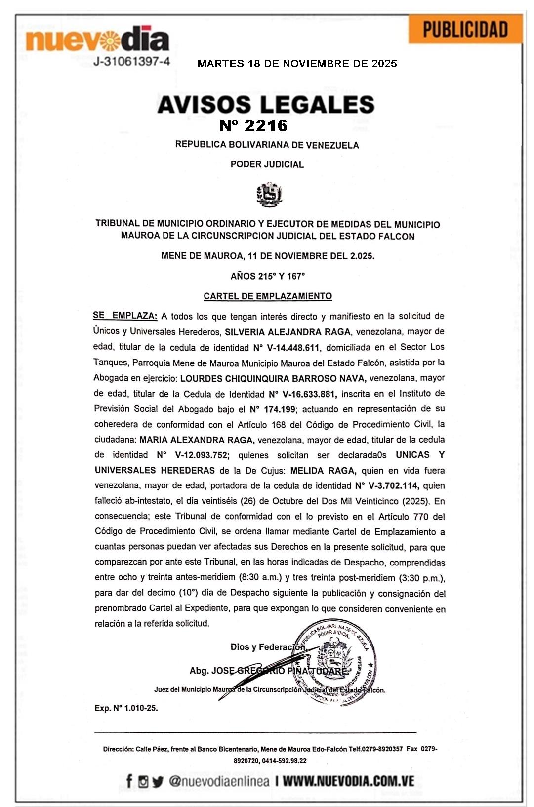 InicioPublicidadLegales PublicidadLegales Cartel de Emplazamiento.Melida Raga. 18/11/2025 FacebookTwitterPinterestWhatsApp 2216. 18-11-2025 Cuota FacebookTwitterPinterestWhatsApp Artículo anteriorSiete universidades se dan cita en los Juegos Universitarios UPTAG 2025Artículo siguienteCartel de Emplazamiento.Gonzalo Dolores Macho Pineda. Mercadeo NuevoDia Noticias Relacionadas Legales Cartel de Emplazamiento.Gonzalo Dolores Macho Pineda. Legales Edicto.José Gregorio Loyo Leal. Legales Edicto.José Vicente Pérez Borjas. Redes Sociales20,299FansMe gusta112,425SeguidoresSeguir4,600SuscriptoresSuscribirte Últimas noticias Destacadas El Zulia se desborda de fe en honor a la Virgen de Chiquinquirá Destacadas Maduro reitera invitación a Trump para un diálogo «cara a cara» Cargar más