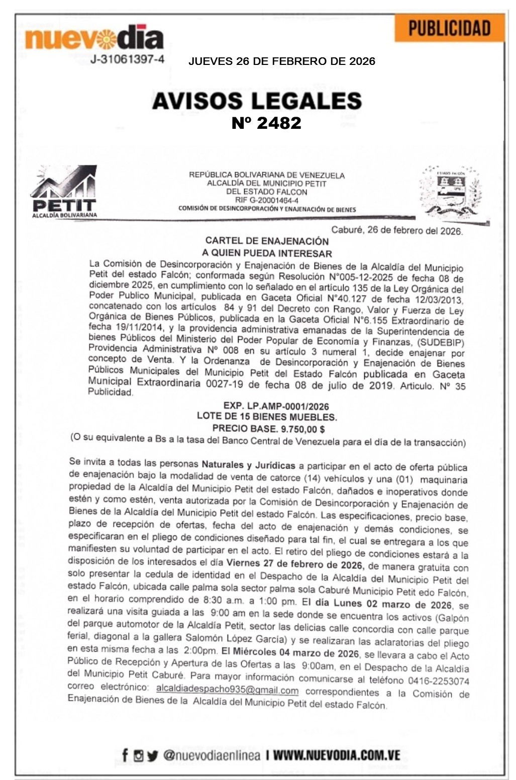 InicioPublicidadLegales PublicidadLegales Cartel de Enajenación.Alcaldia del Municipio Petit del Estado Falcón. 26/02/2026 FacebookTwitterPinterestWhatsApp 2482. 26-02-2026 Cuota FacebookTwitterPinterestWhatsApp Artículo anteriorPrimera del 26 de febrero de 2026Artículo siguienteCartel de Intimación.Daniela José Arcaya Mendoza. Mercadeo NuevoDia Noticias Relacionadas Legales Edicto.Virgilio José Osteicoechea Martínez,Yaritza Osteicoechea Petit y José Virgilio Osteicoechea Petit. Legales Cartel de Intimación.Daniela José Arcaya Mendoza. Legales Acta Asamblea Extraordinaria.Gmaaz Industrial de Alimentos.C.A. Redes Sociales20,299FansMe gusta112,425SeguidoresSeguir4,600SuscriptoresSuscribirte Últimas noticias Destacadas Así amanece el precio del dólar en Venezuela hoy 26-Feb Destacadas Renuncian: Fiscal General y Defensor del Pueblo presentan sus cartas ante la Asamblea Nacional Cargar más