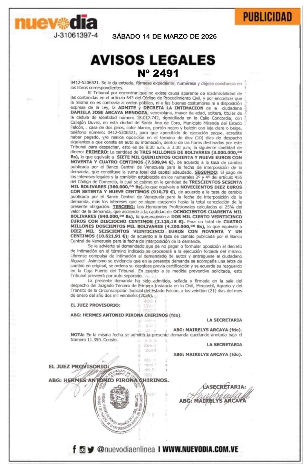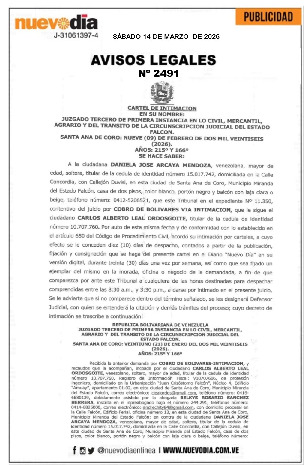 InicioPublicidadLegales PublicidadLegales Cartel de Intimación.Daniela José Arcaya Mendoza. 14/03/2026 FacebookTwitterPinterestWhatsApp 2491. 14-03-2026 Cuota FacebookTwitterPinterestWhatsApp Artículo anteriorEsto dijo Donald Trump a María Corina Machado sobre su regreso a Venezuela Mercadeo NuevoDia Noticias Relacionadas Legales Cartel de Citación.Maricarmen Miranda Bravo. Legales Edicto.Francisco D’Sales Sandoval Rodríguez. Legales Edicto.Antonio Assal Mubarek. Redes Sociales20,299FansMe gusta112,425SeguidoresSeguir4,600SuscriptoresSuscribirte Últimas noticias Destacadas Venezuela arrancó marzo como el cuarto proveedor petrolero de EE.UU. Destacadas Altos niveles de abastecimiento de alimentos en Venezuela reportan autoridades Cargar más