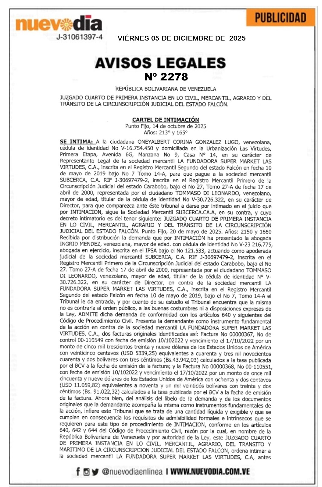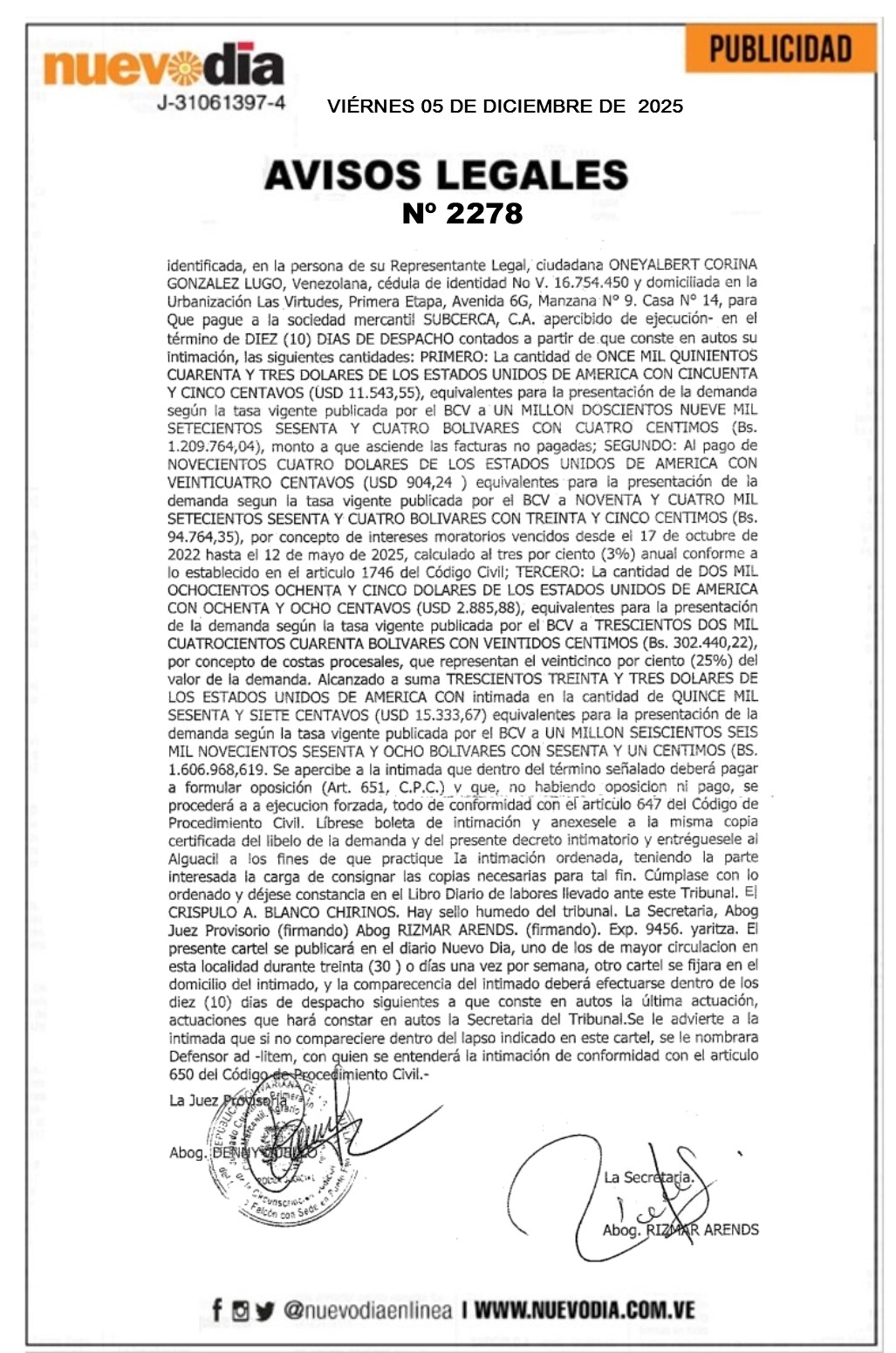 Cartel de Intimación.Oneyalbert Corina González Lugo.