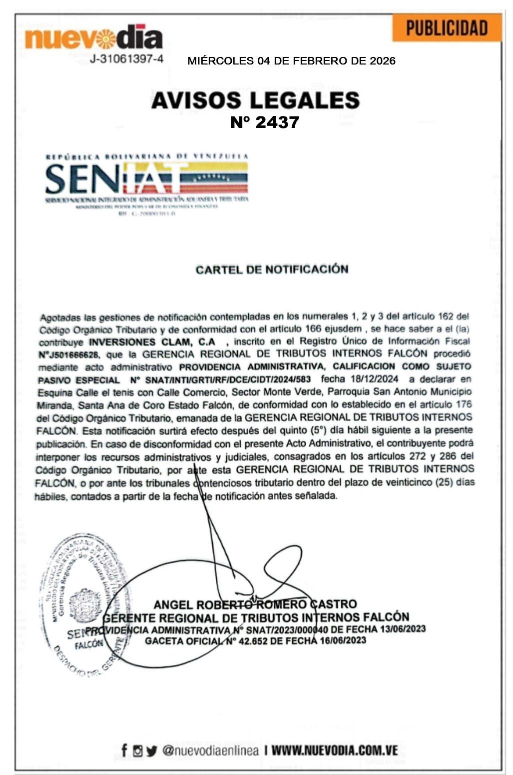InicioPublicidadLegales PublicidadLegales Cartel de Notificación.Inversiones Clam.C.A. 04/02/2026 FacebookTwitterPinterestWhatsApp 2437. 04-02-2026 Cuota FacebookTwitterPinterestWhatsApp Artículo anteriorCartel de Notificación.Aluvisa.S.A.Artículo siguienteCartel de Notificación.Marbiel Antonio Toyo Hernández(Inversiones M.M. de Marbiel Toyo Hernández). Mercadeo NuevoDia Noticias Relacionadas Legales Cartel de Notificación.Procesadora y Distribuidora Medina González.C.A. Legales Cartel de Notificación.Marbiel Antonio Toyo Hernández(Inversiones M.M. de Marbiel Toyo Hernández). Legales Cartel de Notificación.Aluvisa.S.A. Redes Sociales20,299FansMe gusta112,425SeguidoresSeguir4,600SuscriptoresSuscribirte Últimas noticias Destacadas Este 4-Feb llegaron 273 connacionales desde EE.UU. Destacadas Extraoficial | Alex Saab y Raúl Gorrín habrían sido detenidos este 4-Feb Cargar más