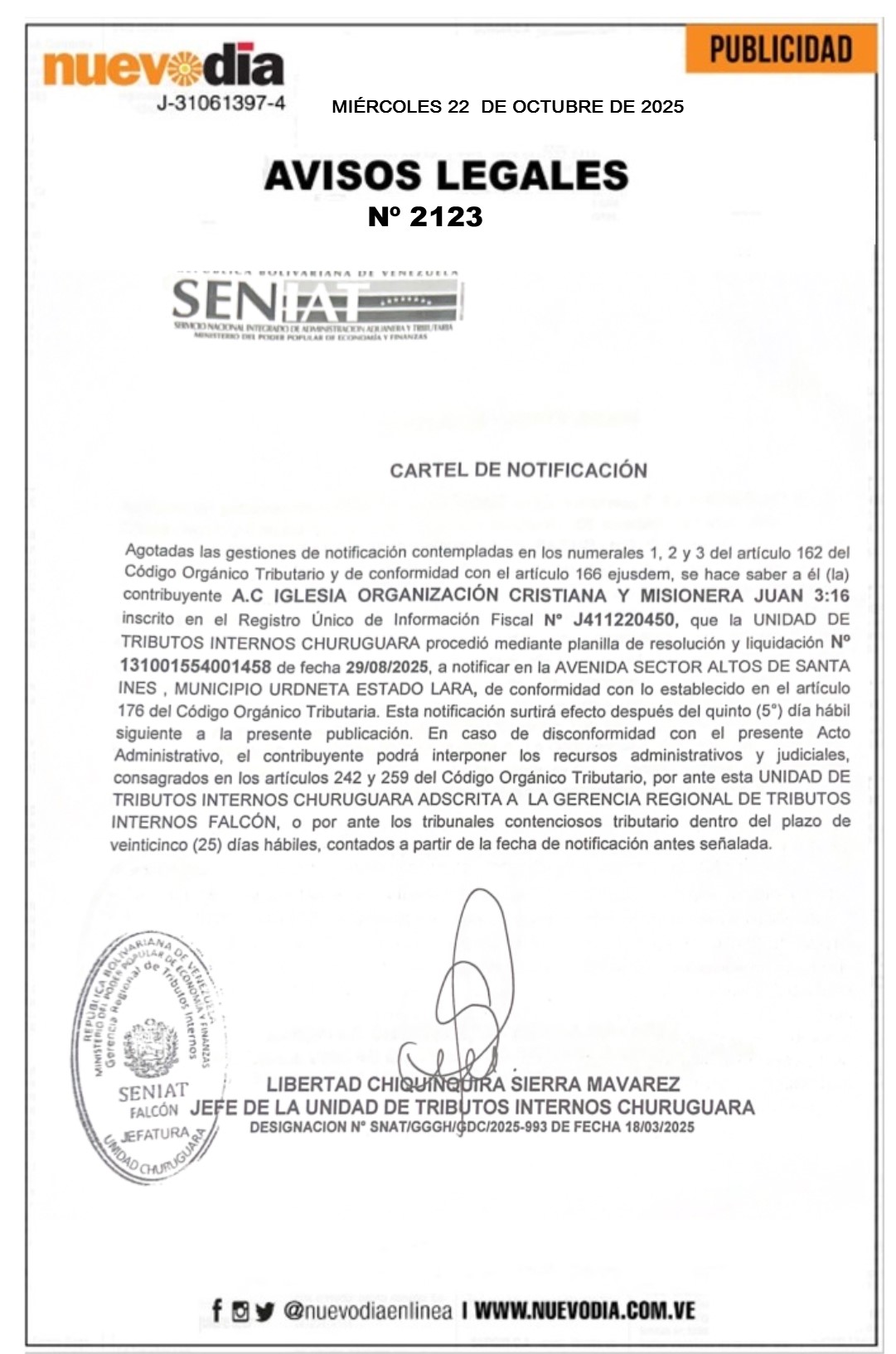 InicioPublicidadLegales PublicidadLegales Cartel de Notificación.A.C. Iglesia Organización Cristiana y Misionera Juán 3:16. 22/10/2025 FacebookTwitterPinterestWhatsApp 2123. 22-10-2025 Cuota FacebookTwitterPinterestWhatsApp Artículo anteriorCartel de Notificación.Multi-Servicio Caribe, 67,C.A.Artículo siguienteCartel de Notificación.Inversiones Los Corderos de Parupano,C.A. Mercadeo NuevoDia Noticias Relacionadas Legales Cartel de Notificación.Automercado Virgen del Carmen, C.A. Legales Cartel de Notificación.Samor,C.A. Legales Cartel de Notificación.Agrototal 2019,C.A. Redes Sociales20,299FansMe gusta112,425SeguidoresSeguir4,600SuscriptoresSuscribirte Últimas noticias Destacadas PDVSA factura $ 11.700 millones en nueve meses por exportaciones petroleras Destacadas Trasladan fiesta de los santos a parroquias por gran cantidad de fieles (COMUNICADO) Cargar más