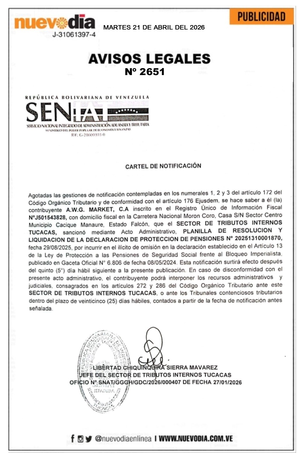 InicioPublicidadLegales PublicidadLegales Cartel de Notificación.A.W.G. Market.C.A. 21/04/2026 FacebookTwitterPinterestWhatsApp 2651. 21-04-2026 Cuota FacebookTwitterPinterestWhatsApp Artículo anteriorNuevo cuartel general 19 de Diciembre dignificará servicio bomberil en FalcónArtículo siguienteCartel de Notificación.Lencerias y Algo Más 2014.C.A. Mercadeo NuevoDia Noticias Relacionadas Legales Cartel de Notificación.Inversiones Luismarys 207.C.A. Legales Cartel de Notificación.Inversiones Hosana en las Alturas.C.A. Legales Cartel de Notificación.Fumiclean Falcón.C.A. Redes Sociales20,299FansMe gusta112,425SeguidoresSeguir4,600SuscriptoresSuscribirte Últimas noticias Destacadas AN prepara selección del comité encargado de evaluar aspirantes a magistrados del TSJ Destacadas Jorge Arreaza: María Corina no aplica para ser beneficiada por la Ley de Amnistía Cargar más