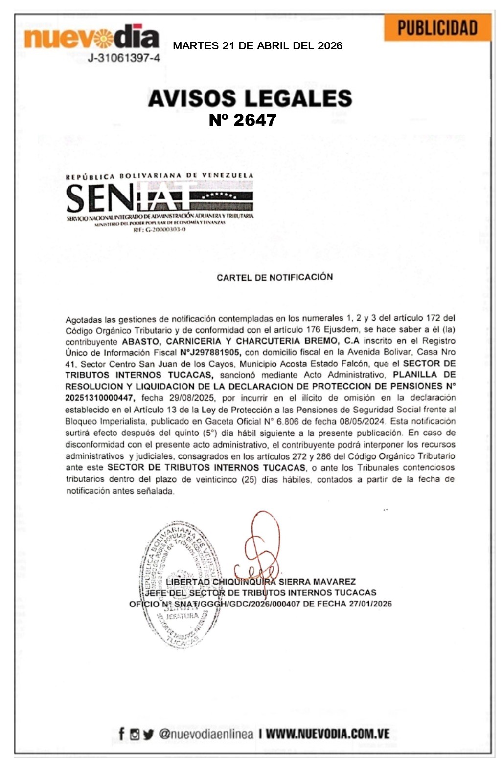 InicioPublicidadLegales PublicidadLegales Cartel de Notificación.Abasto.Carnicería y Charcutería Bremo.C.A. 21/04/2026 FacebookTwitterPinterestWhatsApp 2647. 21-04-2026 Cuota FacebookTwitterPinterestWhatsApp Artículo anteriorCartel de Notificación.Sutra Coco.C.A.Artículo siguienteCartel de Notificación.UPF Bodega La Matica. Mercadeo NuevoDia Noticias Relacionadas Legales Cartel de Notificación.Brisas de Chichiriviche.C.A. Legales Cartel de Notificación.KBA Styles Moda.C.A. Legales Cartel de Notificación.Grupo Arteinmueble.C.A. Redes Sociales20,299FansMe gusta112,425SeguidoresSeguir4,600SuscriptoresSuscribirte Últimas noticias Destacadas AN prepara selección del comité encargado de evaluar aspirantes a magistrados del TSJ Destacadas Jorge Arreaza: María Corina no aplica para ser beneficiada por la Ley de Amnistía Cargar más