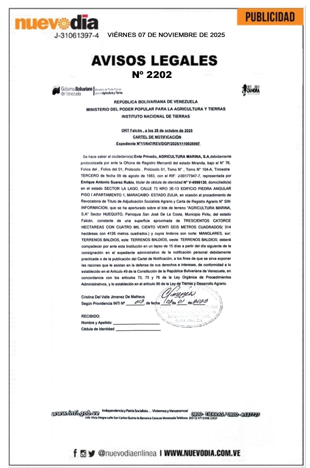 InicioPublicidadLegales PublicidadLegales Cartel de Notificación.Agricultura Marina.S.A. 07/11/2025 FacebookTwitterPinterestWhatsApp 2202. 07-11-2025 Cuota FacebookTwitterPinterestWhatsApp Artículo anteriorEdicto.Flora Beatriz Loyo de Toyo, José Angel Toyo Acosta, José Antonio Toyo Loyo, Jésus Israel Toyo Loyo, Yoel Rafael Toyo Loyo, Henry Gregorio Toyo Loyo e Ivan Jesús Toyo Loyo.Artículo siguienteAsí está el precio del dólar en Venezuela hoy 7-Nov Mercadeo NuevoDia Noticias Relacionadas Legales Notificación.Francisco Esteban Yánez Rodríguez. Legales Edicto.Nidia Chiquinquira Delgado. Legales Edicto.Flora Beatriz Loyo de Toyo, José Angel Toyo Acosta, José Antonio Toyo Loyo, Jésus Israel Toyo Loyo, Yoel Rafael Toyo Loyo, Henry Gregorio Toyo... Redes Sociales20,299FansMe gusta112,425SeguidoresSeguir4,600SuscriptoresSuscribirte Últimas noticias Destacadas Incautan 1.253 kilos de súper marihuana en Lara +DETALLES Destacadas Gasto promedio por visita en centros comerciales ronda los $60 Cargar más