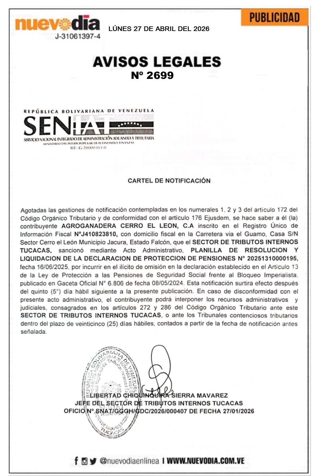 InicioPublicidadLegales PublicidadLegales Cartel de Notificación.Agroganadera Cerro El León.C.A. 27/04/2026 FacebookTwitterPinterestWhatsApp 2699. 27-04-2026 Cuota FacebookTwitterPinterestWhatsApp Artículo anteriorCartel de Notificación.Distribuidora El Gran Pollo 2017.C.A. Mercadeo NuevoDia Noticias Relacionadas Legales Cartel de Notificación.Distribuidora El Gran Pollo 2017.C.A. Legales Cartel de Notificación.Corporación Turística Aguasanta.C.A. Legales Cartel de Notificación.Piscinas Hidrotécnicas Tucacas.C.A. Redes Sociales20,299FansMe gusta112,425SeguidoresSeguir4,600SuscriptoresSuscribirte Últimas noticias Destacadas Rechazan fin de la Ley de Amnistía anunciado por Rodríguez Destacadas Así transcurrió la reunión entre Delcy Rodríguez y Petro (FOTOS) Cargar más