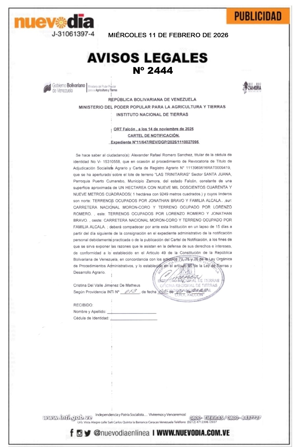 InicioPublicidadLegales PublicidadLegales Cartel de Notificación.Alexander Rafael Romero Sánchez. 11/02/2026 FacebookTwitterPinterestWhatsApp 2444. 11-02-2026 Cuota FacebookTwitterPinterestWhatsApp Artículo anteriorBDV | Sigue activa venta de divisas a personas naturales +MONTOSArtículo siguienteSeis detenidos en riña colectiva en Los Taques +DETALLES Mercadeo NuevoDia Noticias Relacionadas Legales Edicto.Virgilio José Osteicoechea Martínez,Yaritza Osteicoechea Petit y José Virgilio Osteicoechea Petit. Legales Registro Mercantil.Centro de Formación Integral, Cultural, Deportivo y Recreativo La Providencia.C.A. Legales Edicto.Eddy Anselm Rojas Romero. Redes Sociales20,299FansMe gusta112,425SeguidoresSeguir4,600SuscriptoresSuscribirte Últimas noticias Destacadas Así está el precio del dólar hoy 11-Feb Destacadas Conviasa suspende temporalmente vuelos a Cuba y Nicaragua Cargar más