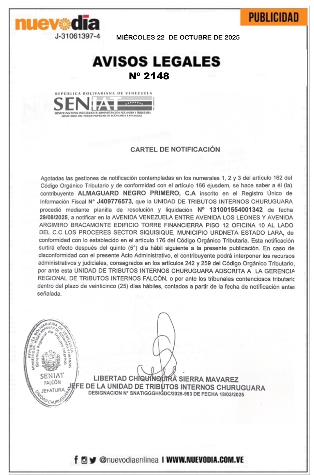 Cartel de Notificación.AlmaGuard Negro Primero, C.A.