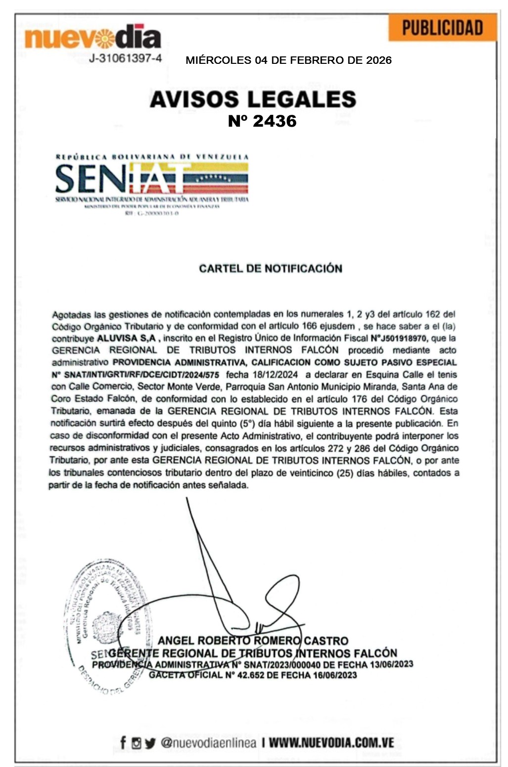 InicioPublicidadLegales PublicidadLegales Cartel de Notificación.Aluvisa.S.A. 04/02/2026 FacebookTwitterPinterestWhatsApp 2436. 04-02-2026 Cuota FacebookTwitterPinterestWhatsApp Artículo anteriorCartel de Notificación.Merk’ Todo Coro.C.A.Artículo siguienteCartel de Notificación.Inversiones Clam.C.A. Mercadeo NuevoDia Noticias Relacionadas Legales Cartel de Notificación.Procesadora y Distribuidora Medina González.C.A. Legales Cartel de Notificación.Marbiel Antonio Toyo Hernández(Inversiones M.M. de Marbiel Toyo Hernández). Legales Cartel de Notificación.Inversiones Clam.C.A. Redes Sociales20,299FansMe gusta112,425SeguidoresSeguir4,600SuscriptoresSuscribirte Últimas noticias Destacadas Este 4-Feb llegaron 273 connacionales desde EE.UU. Destacadas Extraoficial | Alex Saab y Raúl Gorrín habrían sido detenidos este 4-Feb Cargar más