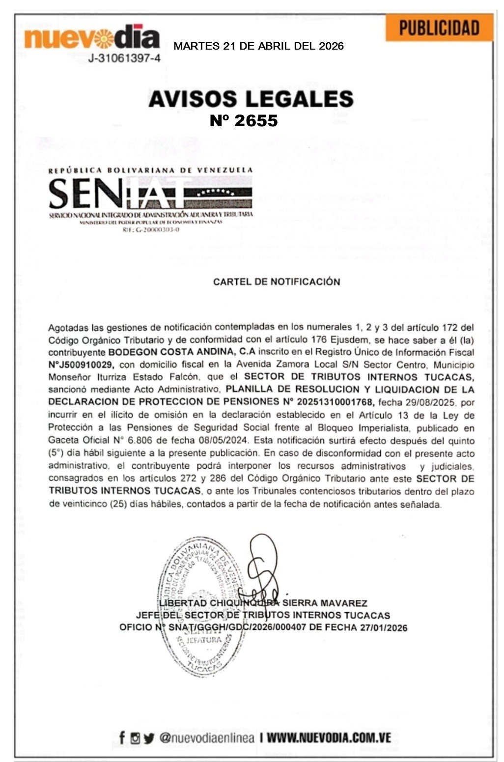 Cartel de Notificación.Bodegón Costa Andina.C.A.